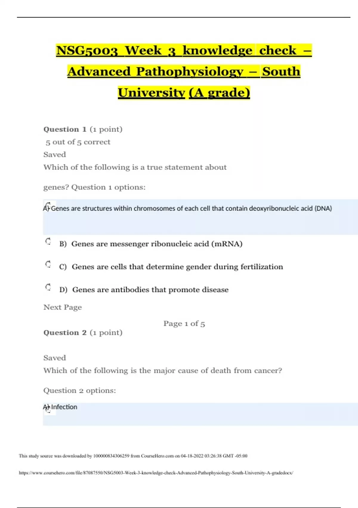 NSG5003 Week 3 knowledge check – Advanced Pathophysiology – South University (A grade) Question 1 (1 point) 5 out of 5 correct Saved Which of the following is a true statement about genes? Question 1 options: B) Genes are messenger ribonucleic acid (mRNA) C) Genes are cells that determine gender during fertilization D) Genes are antibodies that promote disease Next Page Question 2 (1 point) Page 1 of 5 Saved Which of the following is the major cause of death from cancer? Question 2 options:
