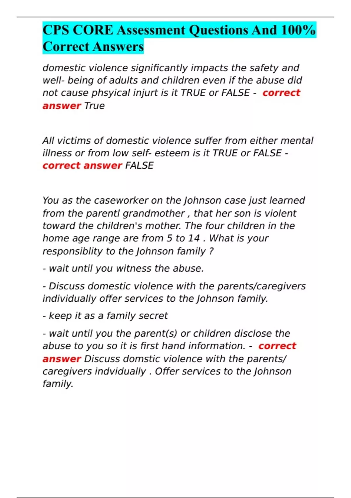 , CPS CORE Assessment Questions And 100%