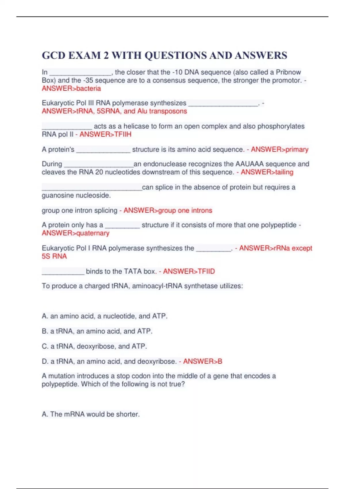 GCD EXAM 2 WITH QUESTIONS AND ANSWERS In ________________, the closer that the -10 DNA sequence (also called a Pribnow Box) and the -35 sequence are to a consensus sequence, the stronger the promotor. - ANSWER>bacteria Eukaryotic Pol III RNA polymerase synthesizes __________________. - ANSWER>tRNA, 5SRNA, and Alu transposons _____________ acts as a helicase to form an open complex and also phosphorylates RNA pol II - ANSWER>TFIIH A protein's ______________ structure is its amino acid sequence. - ANSWER>primary During __________________an endonuclease recognizes the AAUAAA sequence and cleaves the RNA 20 nucleotides downstream of this sequence. - ANSWER>tailing __________________________can splice in the absence of protein but requires a guanosine nucleoside. group one intron splicing - ANSWER>group one introns A protein only has a _________ structure if it consists of more that one polypeptide - ANSWER>quaternary Eukaryotic Pol I RNA polymerase synthesizes the _________. - ANSWER>rRNa except 5S RNA ___________ binds to the TATA box. - ANSWER>TFIID To produce a charged tRNA, aminoacyl-tRNA synthetase utilizes: A. an amino acid, a nucleotide, and ATP. B. a tRNA, an amino acid, and ATP. C. a tRNA, deoxyribose, and ATP. D. a tRNA, an amino acid, and deoxyribose. - ANSWER>B A mutation introduces a stop codon into the middle of a gene that encodes a polypeptide. Which of the following is not true? A. The mRNA would be shorter. B. All of the other three options are true. C. The polypeptide would be shorter. D. The rate of transcription would be unaffected. - ANSWER>A Allolactose is a ___________ that __________ transcription. A. small effector molecule, inhibits B. regulatory protein, enhances. C. regulatory protein, inhibits D. small effector molecule, enhances - ANSWER>A When an E. coli cell is exposed to glucose, how does this affect the regulation of the lac operon via CAP? A. cAMP binds to CAP and transcription is decreased. B. cAMP does not bind to CAP and transcription is decreased. C. cAMP does not bind to CAP and transcription is increased. D. cAMP binds to CAP and transcription is increased. - ANSWER>B Translation can be regulated by: A. both translational repressor proteins and antisense RNA that can bind mRNA. B. translational repressor proteins that bind mRNA. C. antisense RNA. D. phosphorylation of the mRNA. - ANSWER>A Which of the following does not happen for CREB protein to activate a gene? A. The binding of a small effector molecule to the CREB protein B. All of the other three options happen. C. Covalent modification of the CREB protein D. Protein-protein interaction (e.g., dimer formation) - ANSWER>A ________ and acetylation are examples of a reversible protein modification. - ANSWER>phosphorylation, methylation ________ links distant enhancers and silencers to core promotors. - ANSWER>mediator The ________ motif is used by some proteins to form dimers. - ANSWER>leucine zipper Three alternative types of repressive chromatin can be distinguished from the others by: A. (1) H3K36me3, (2) H3K9me3, (3) H3K27me3 B. (1) H3K4me3, (2) H3K9me3, (3) H3K27me3 C. (1) HP1, (2) PRC1, (3) H3K27me3 D. (1) HP1, (2) PRC1, (3) DNA methylation - ANSWER>A Exposure of Avy mice to alcohol until shortly before giving birth results in A. A higher proportion of (pseudo)agouti coat color in the pups B. A higher proportion yellow/orange coat color in the pups C. No difference in the proportion of (pseudo)agouti and yellow/orange coat color in the pups - ANSWER>A The heterochromatin at the beta-globin locus is called _________________ - ANSWER>facultative heterochromatin The _________________ deletes the LCR that causes the entire region to be remodeled into euchromatin but leaves all beta globin genes intact. - ANSWER>hispanic deletion ___________ exists in and around the centromere. - ANSWER>constitutive heterochromatin 3 methyl groups on Lysine 27 of histone H3 (H3K27me3) causes the nucleosome to be bound by - ANSWER>polycomb protein complex 1