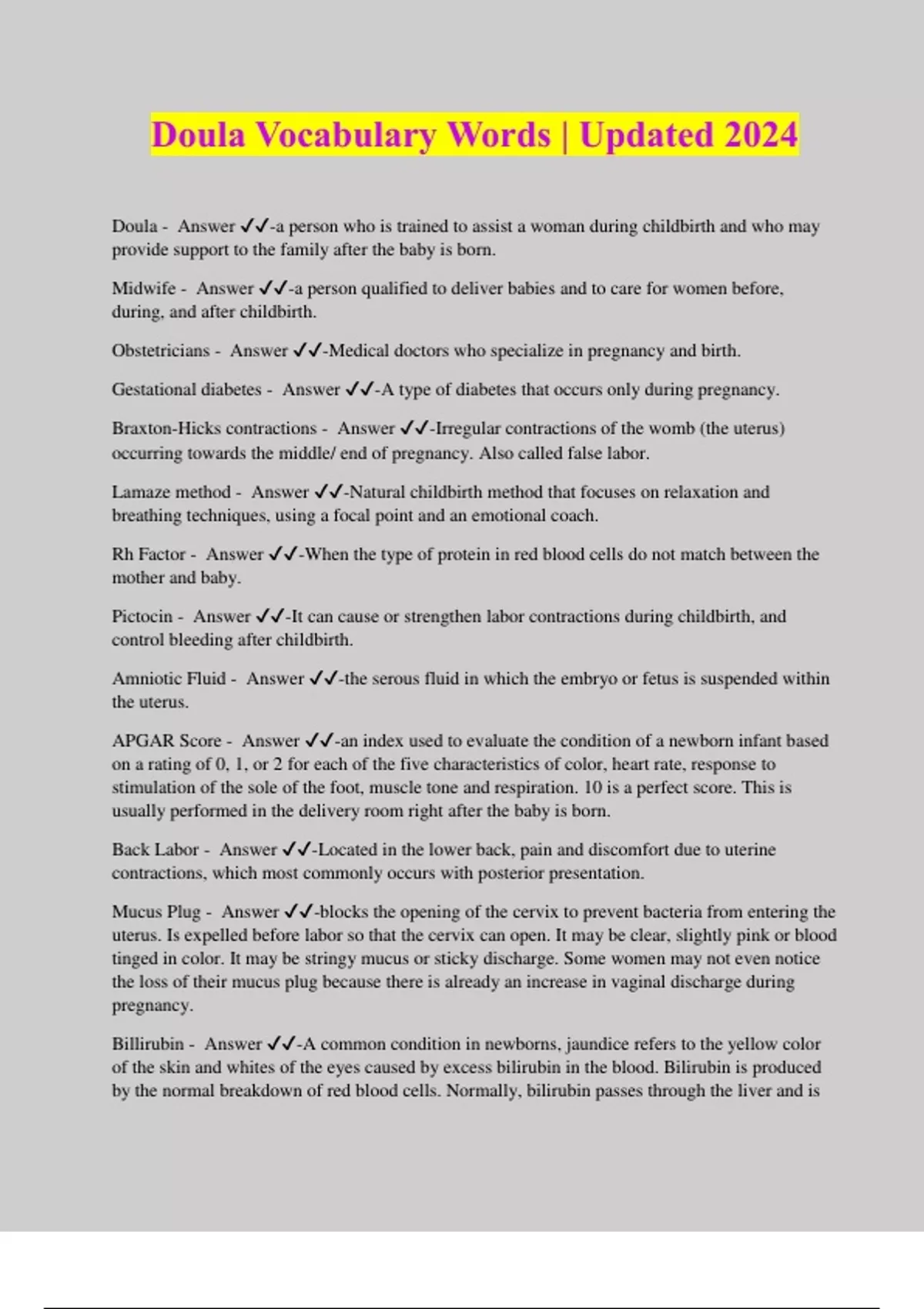 Doula Vocabulary Words | Updated 2024 Doula - Answer ️️ -a person who is trained to assist a woman during childbirth and who may provide support to the family after the baby is born. Midwife - Answer ️️ -a person qualified to deliver babies and to care for women before, during, and after childbirth. Obstetricians - Answer ️️ -Medical doctors who specialize in pregnancy and birth. Gestational diabetes - Answer ️️ -A type of diabetes that occurs only during pregnancy. Braxton-Hicks contractions - Answer ️️ -Irregular contractions of the womb (the uterus) occurring towards the middle/ end of pregnancy. Also called false labor. Lamaze method - Answer ️️ -Natural childbirth method that focuses on relaxation and breathing techniques, using a focal point and an emotional coach. Rh Factor - Answer ️️ -When the type of protein in red blood cells do not match between the mother and baby. Pictocin - Answer ️️ -It can cause or strengthen labor contractions during childbirth, and control bleeding after childbirth. Amniotic Fluid - Answer ️️ -the serous fluid in which the embryo or fetus is suspended within the uterus. APGAR Score - Answer ️️ -an index used to evaluate the condition of a newborn infant based on a rating of 0, 1, or 2 for each of the five characteristics of color, heart rate, response to stimulation of the sole of the foot, muscle tone and respiration. 10 is a perfect score. This is usually performed in the delivery room right after the baby is born. Back Labor - Answer ️️ -Located in the lower back, pain and discomfort due to uterine contractions, which most commonly occurs with posterior presentation. Mucus Plug - Answer ️️ -blocks the opening of the cervix to prevent bacteria from entering the uterus. Is expelled before labor so that the cervix can open. It may be clear, slightly pink or blood tinged in color. It may be stringy mucus or sticky discharge. Some women may not even notice the loss of their mucus plug because there is already an increase in vaginal discharge during pregnancy. Billirubin - Answer ️️ -A common condition in newborns, jaundice refers to the yellow color of the skin and whites of the eyes caused by excess bilirubin in the blood. Bilirubin is produced by the normal breakdown of red blood cells. Normally, bilirubin passes through the liver and is