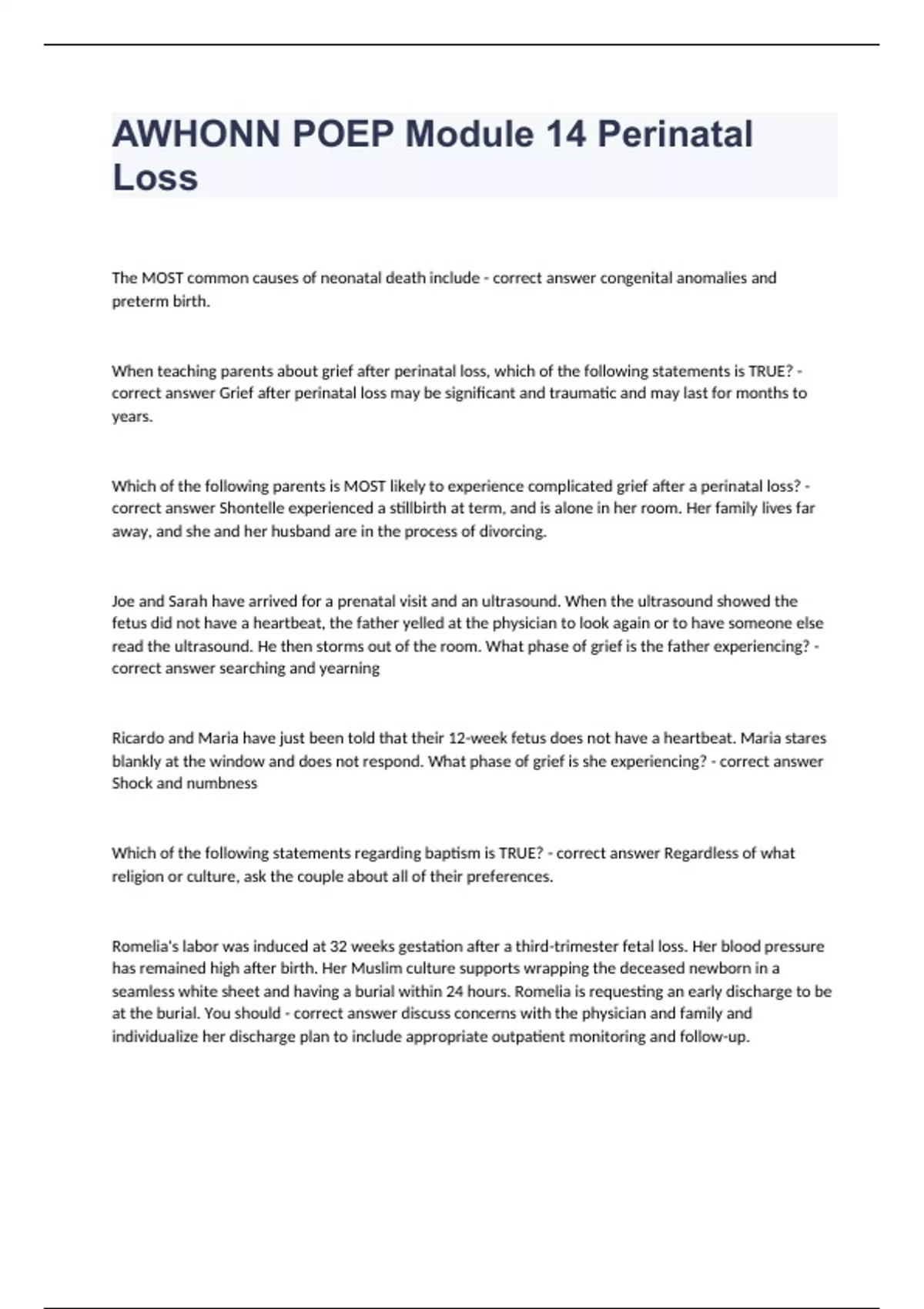 AWHONN POEP Module 14 Perinatal Loss The MOST common causes of neonatal death include - correct answer congenital anomalies and preterm birth. When teaching parents about grief after perinatal loss, which of the following statements is TRUE? - correct answer Grief after perinatal loss may be significant and traumatic and may last for months to years. Which of the following parents is MOST likely to experience complicated grief after a perinatal loss? - correct answer Shontelle experienced a stillbirth at term, and is alone in her room. Her family lives far away, and she and her husband are in the process of divorcing. Joe and Sarah have arrived for a prenatal visit and an ultrasound. When the ultrasound showed the fetus did not have a heartbeat, the father yelled at the physician to look again or to have someone else read the ultrasound. He then storms out of the room. What phase of grief is the father experiencing? - correct answer searching and yearning Ricardo and Maria have just been told that their 12-week fetus does not have a heartbeat. Maria stares blankly at the window and does not respond. What phase of grief is she experiencing? - correct answer Shock and numbness Which of the following statements regarding baptism is TRUE? - correct answer Regardless of what religion or culture, ask the couple about all of their preferences. Romelia's labor was induced at 32 weeks gestation after a third-trimester fetal loss. Her blood pressure has remained high after birth. Her Muslim culture supports wrapping the deceased newborn in a seamless white sheet and having a burial within 24 hours. Romelia is requesting an early discharge to be at the burial. You should - correct answer discuss concerns with the physician and family and individualize her discharge plan to include appropriate outpatient monitoring and follow-up.