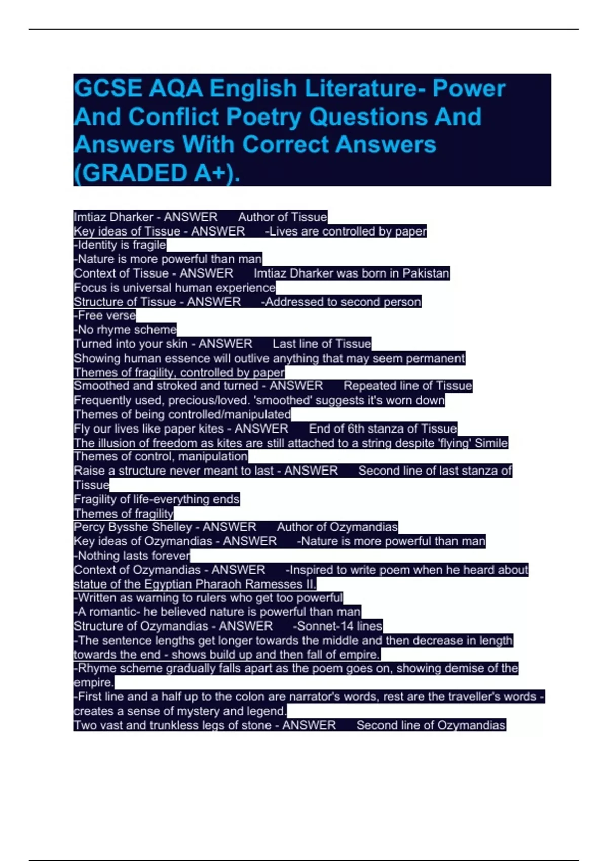 GCSE AQA English Literature- Power And Conflict Poetry Questions And Answers With Correct Answers (GRADED A+).