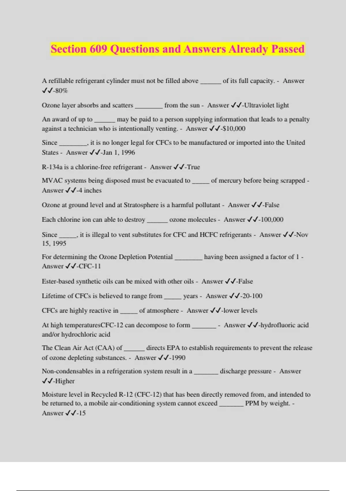 Section 609 Questions and Answers Already Passed A refillable refrigerant cylinder must not be filled above ______ of its full capacity. - Answer ️️ -80% Ozone layer absorbs and scatters ________ from the sun - Answer ️️ -Ultraviolet light An award of up to ______ may be paid to a person supplying information that leads to a penalty against a technician who is intentionally venting. - Answer ️️ -$10,000 Since ________, it is no longer legal for CFCs to be manufactured or imported into the United States - Answer ️️ -Jan 1, 1996 R-134a is a chlorine-free refrigerant - Answer ️️ -True MVAC systems being disposed must be evacuated to _____ of mercury before being scrapped - Answer ️️ -4 inches Ozone at ground level and at Stratosphere is a harmful pollutant - Answer ️️ -False Each chlorine ion can able to destroy ______ ozone molecules - Answer ️️ -100,000 Since _____, it is illegal to vent substitutes for CFC and HCFC refrigerants - Answer ️️ -Nov 15, 1995 For determining the Ozone Depletion Potential ________ having been assigned a factor of 1 - Answer ️️ -CFC-11 Ester-based synthetic oils can be mixed with other oils - Answer ️️ -False Lifetime of CFCs is believed to range from _____ years - Answer ️️ -20-100 CFCs are highly reactive in _____ of atmosphere - Answer ️️ -lower levels At high temperaturesCFC-12 can decompose to form _______ - Answer ️️ -hydrofluoric acid and/or hydrochloric acid The Clean Air Act (CAA) of ______ directs EPA to establish requirements to prevent the release of ozone depleting substances. - Answer ️️ -1990 Non-condensables in a refrigeration system result in a _______ discharge pressure - Answer ️️ -Higher Moisture level in Recycled R-12 (CFC-12) that has been directly removed from, and intended to be returned to, a mobile air-conditioning system cannot exceed _______ PPM by weight. - Answer ️️ -15