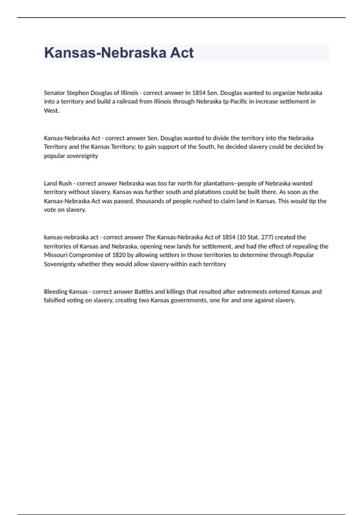 Kansas-Nebraska Act Questions with complete solution 2023/2024Senator Stephen Douglas of Illinois - correct answer In 1854 Sen. Douglas wanted to organize Nebraska into a territory and build a railroad from Illinois through Nebraska tp Pacific in increase settlement in West. Kansas-Nebraska Act - correct answer Sen. Douglas wanted to divide the territory into the Nebraska Territory and the Kansas Territory; to gain support of the South, he decided slavery could be decided by popular sovereignty Land Rush - correct answer Nebraska was too far north for plantations--people of Nebraska wanted territory without slavery. Kansas was further south and platations could be built there. As soon as the Kansas-Nebraska Act was passed, thousands of people rushed to claim land in Kansas. This would tip the vote on slavery.