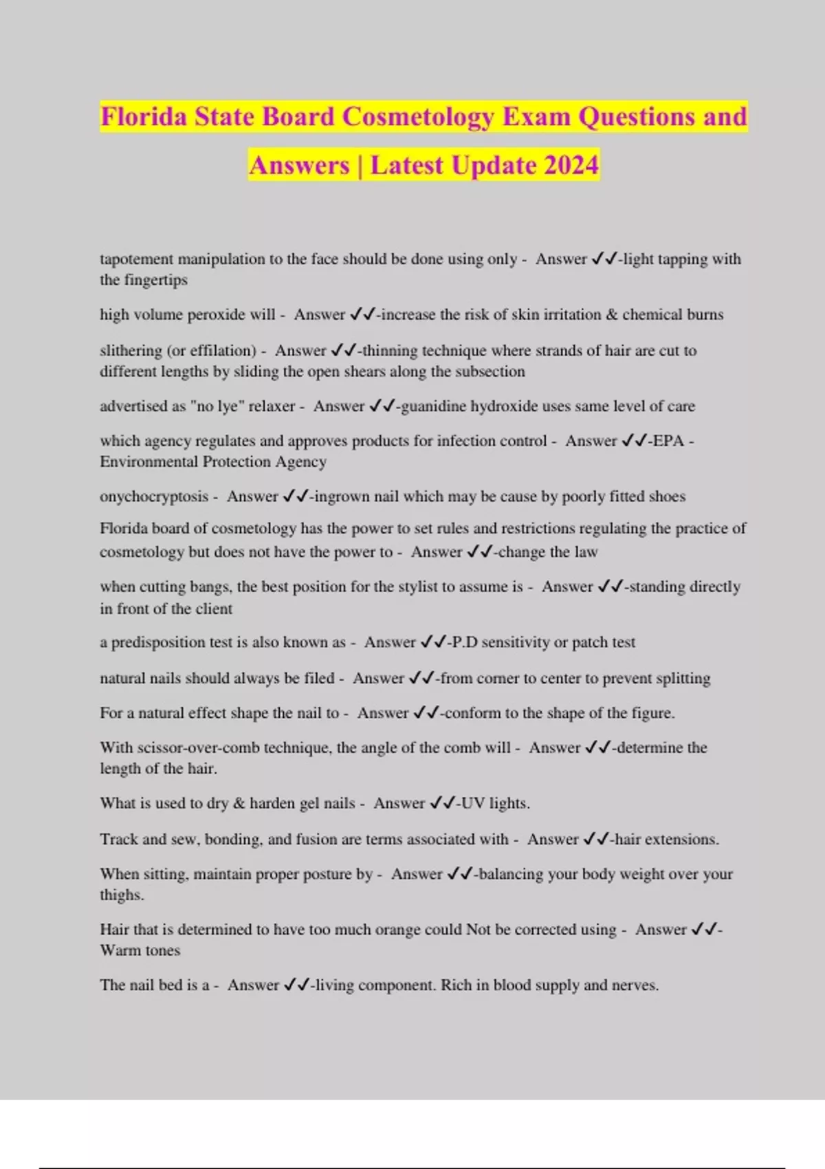 Florida State Board Cosmetology Exam Questions and Answers | Latest Update 2024