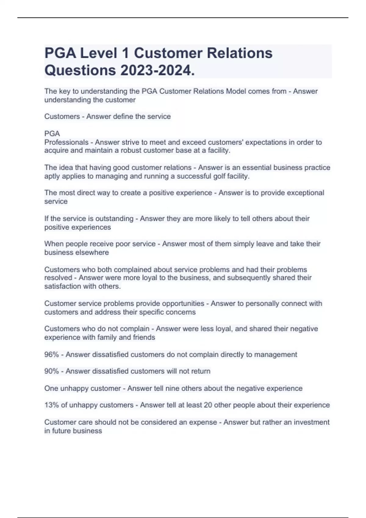 PGA Level 1 Customer Relations Questions . The key to understanding the PGA Customer Relations Model comes from - Answer understanding the customer Customers - Answer define the service PGA Professionals - Answer strive to meet and exceed customers' expectations in order to acquire and maintain a robust customer base at a facility. The idea that having good customer relations - Answer is an essential business practice aptly applies to managing and running a successful golf facility. The most direct way to create a positive experience - Answer is to provide exceptional service If the service is outstanding - Answer they are more likely to tell others about their positive experiences When people receive poor service - Answer most of them simply leave and take their business elsewhere Customers who both complained about service problems and had their problems resolved - Answer were more loyal to the business, and subsequently shared their satisfaction with others. Customer service problems provide opportunities - Answer to personally connect with customers and address their specific concerns Customers who do not complain - Answer were less loyal, and shared their negative experience with family and friends 96% - Answer dissatisfied customers do not complain directly to management 90% - Answer dissatisfied customers will not return One unhappy customer - Answer tell nine others about the negative experience 13% of unhappy customers - Answer tell at least 20 other people about their experience Customer care should not be considered an expense - Answer but rather an investment in future business