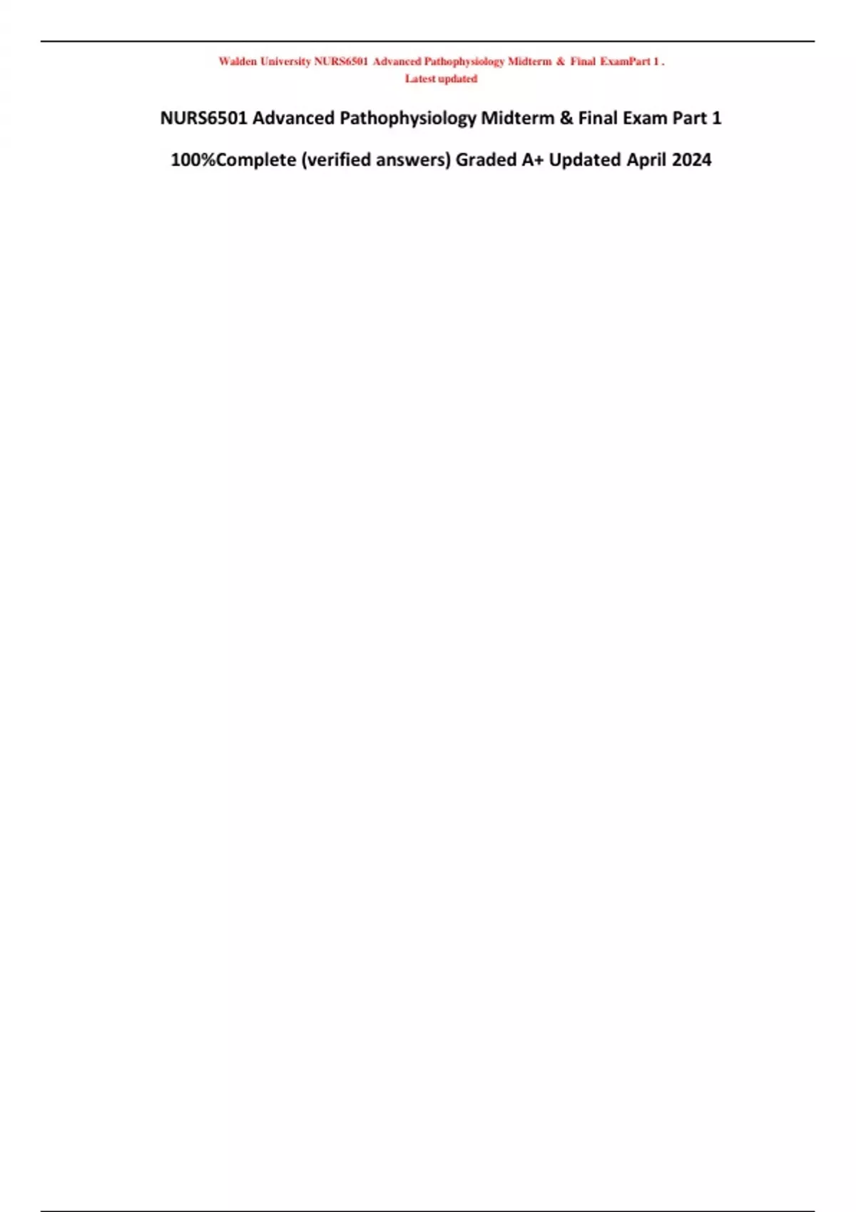 NURS6501 Advanced Pathophysiology Midterm & Final Exam Part 1 100%Complete (verified answers) Graded A+ Updated April 2024 Walden University NURS6501 Advanced Pathophysiology Midterm & Final ExamPart 1 . Latest updated NURS 6501 Advanced Pathophysiology C