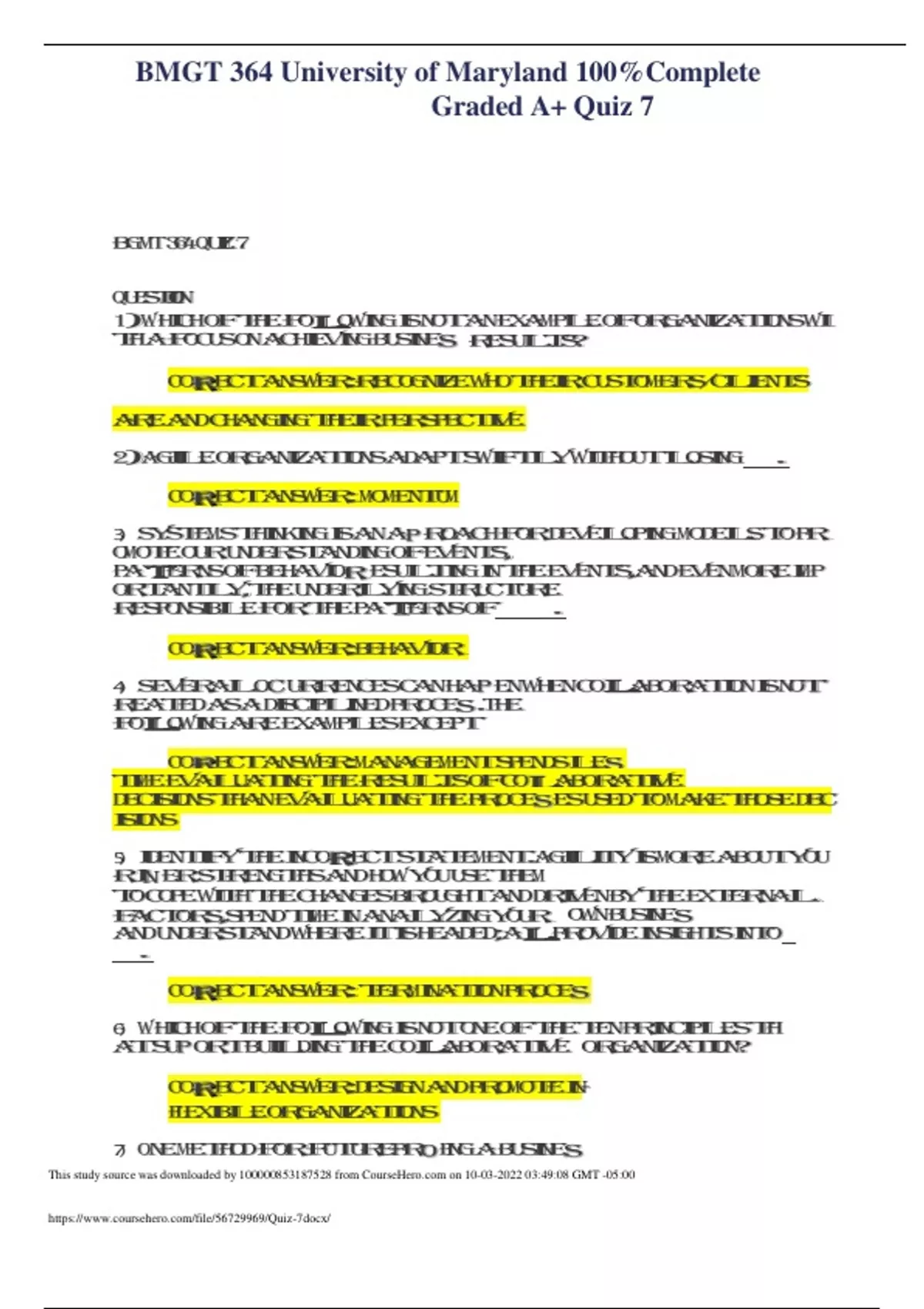 BMGT 364 University of Maryland 100%Complete Graded A+ Quiz 7 wiveverified answ This study source was downloaded by from CourseH on :49:08 GMT -05:00 BGMT364Quiz7 Question 1)Whichofthefolowingisnotanexampleoforganizationswi thafocusonachievingbusines results? Corectanswer:recognizewhotheircustomers/clients areandchangingtheirperspective 2)Agileorganizationsadaptswiftlywithoutlosing . Corectanswer:momentum 3) Systemsthinkingisanaproachfordevelopingmodelstopr omoteourunderstandingofevents, paternsofbehavioresultingintheevents,andevenmoreimp ortantly,theunderlyingstructure responsibleforthepaternsof . Corectanswer:behavior 4) Severalocurrencescanhapenwhencolaborationisnot reatedasadisciplinedproces.The folowingareexamplesexcept Corectanswer:managementspendsles timeevaluatingtheresultsofcolaborative decisionsthanevaluatingtheprocesesusedtomakethosedec isions 5) Identifytheincorectstatement.Agilityismoreaboutyou rinerstrengthsandhowyouusethem tocopewiththechangesbroughtanddrivenbytheexternal factors,spendtimeinanalyzingyour ownbusines andunderstandwhereitisheaded;alprovideinsightsinto . Corectanswer:terminationproces 6) Whichofthefolowingisnotoneofthetenprinciplesth atsuportbuildingthecolaborativ