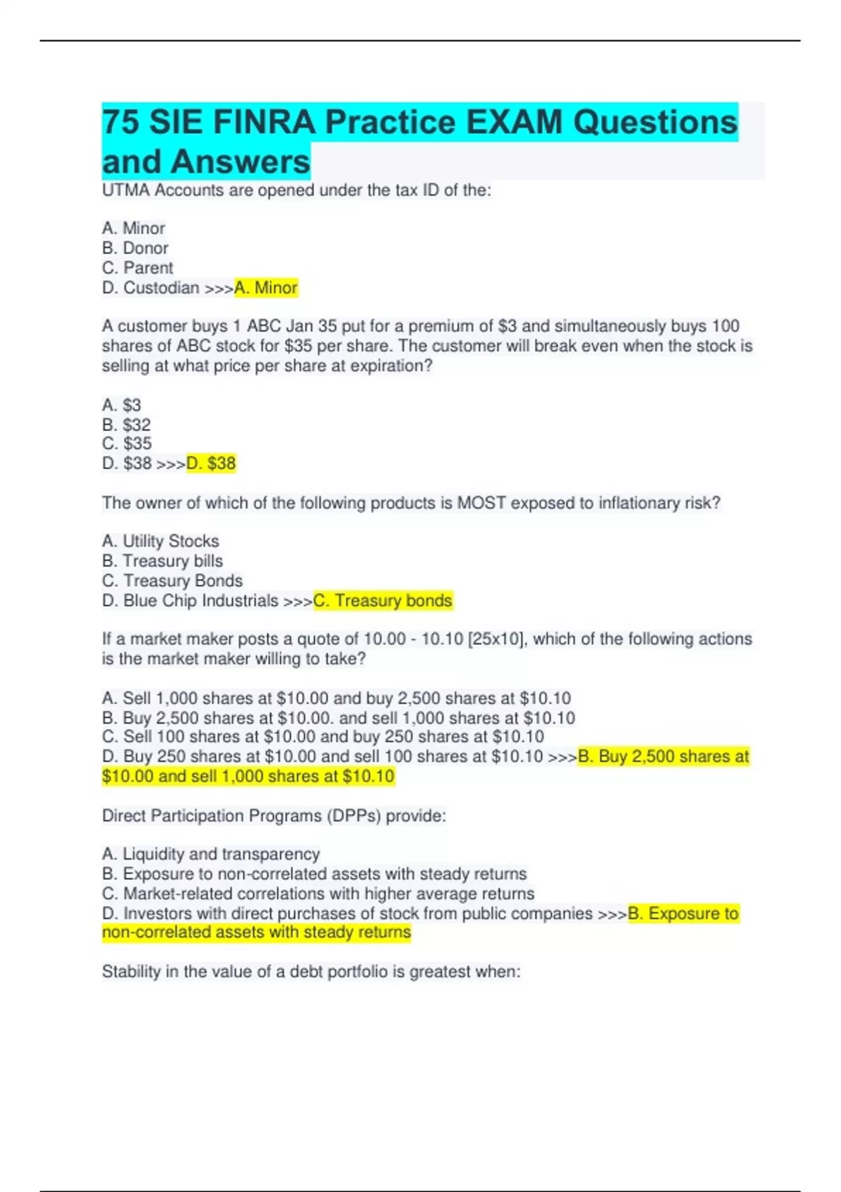 UTMA Accounts are opened under the tax ID of the: A. Minor B. Donor C. Parent D. Custodian A. Minor A customer buys 1 ABC Jan 35 put for a premium of $3 and simultaneously buys 100 shares of ABC stock for $35 per share. The customer will break even when the stock is selling at what price per share at expiration? A. $3 B. $32 C. $35 D. $38 D. $38 The owner of which of the following products is MOST exposed to inflationary risk? A. Utility Stocks B. Treasury bills C. Treasury Bonds D. Blue Chip Industrials C. Treasury bonds If a market maker posts a quote of 10.00 - 10.10 [25x10], which of the following actions is the market maker willing to take? A. Sell 1,000 shares at $10.00 and buy 2,500 shares at $10.10 B. Buy 2,500 shares at $10.00. and sell 1,000 shares at $10.10 C. Sell 100 shares at $10.00 and buy 250 shares at $10.10 D. Buy 250 shares at $10.00 and sell 100 shares at $10.10 B. Buy 2,500 shares at $10.00 and sell 1,000 shares at $10.10 Direct Participation Programs (DPPs) provide: A. Liquidity and transparency B. Exposure to non-correlated assets with steady returns C. Market-related correlations with higher average returns D. Investors with direct purchases of stock from public companies B. Exposure to non-correlated assets with steady returns Stability in the value of a debt portfolio is greatest when:A. Interest rates are rising B. Interest rates are falling C. Maturities of the debt securities are l