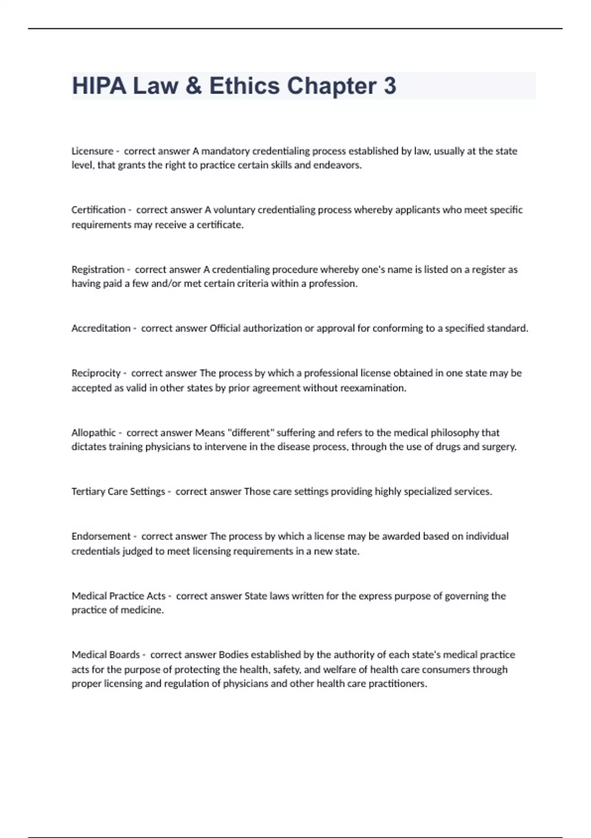 HIPA Law & Ethics Chapter 3 Question and answers correctly solved 2023/2024Licensure - correct answer A mandatory credentialing process established by law, usually at the state level, that grants the right to practice certain skills and endeavors. Certification - correct answer A voluntary credentialing process whereby applicants who meet specific requirements may receive a certificate. Registration - correct answer A credentialing procedure whereby one's name is listed on a register as having paid a few and/or met certain criteria within a profession. Accreditation - correct answer Official authorization or approval for conforming to a specified standard. Reciprocity - correct answer The process by which a professional license obtained in one state may be accepted as valid in other states by prior agreement without reexamination. Allopathic - correct answer Means "different" suffering and refers to the medical philosophy that dictates training physicians