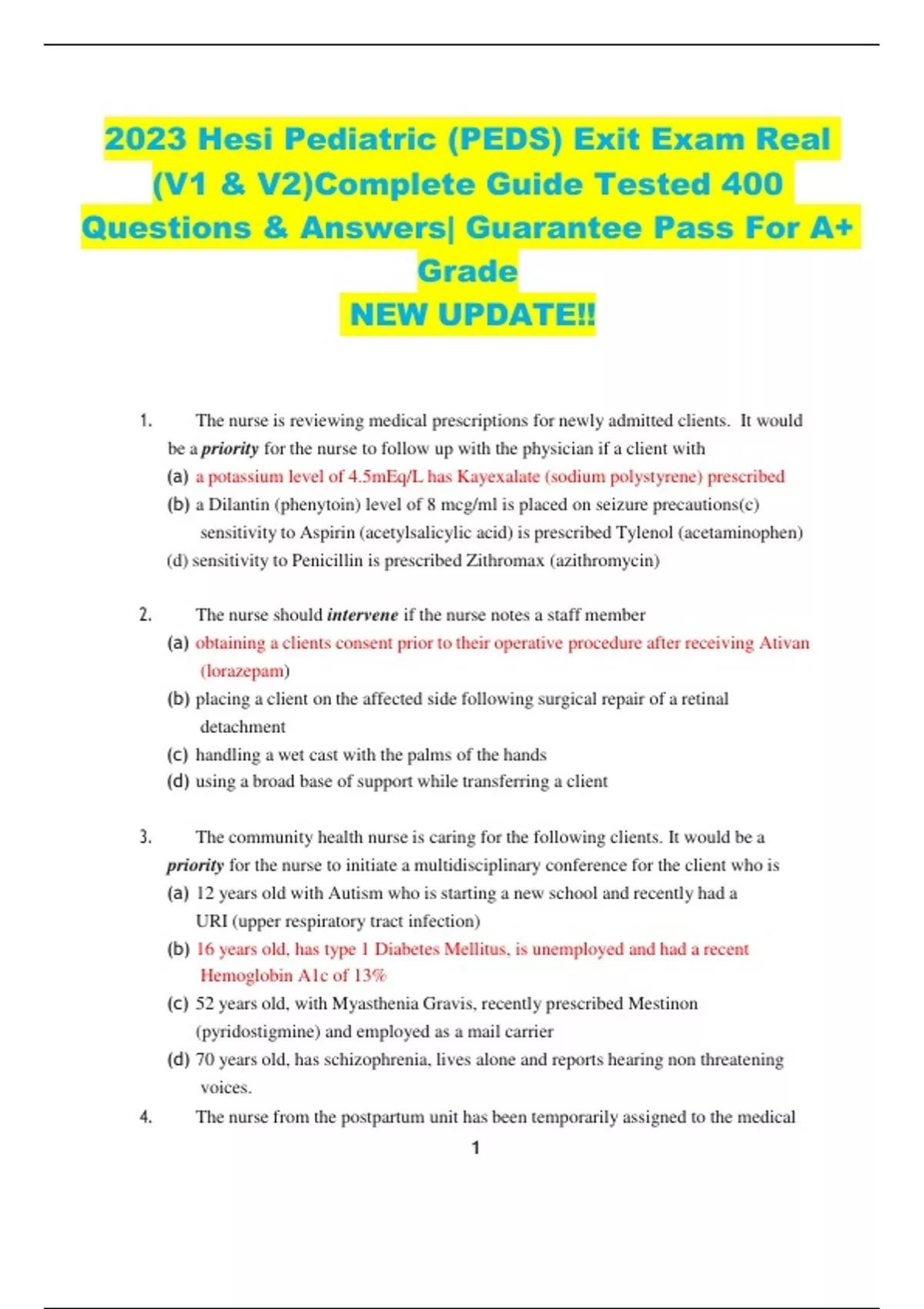 2023 Hesi Pediatric (PEDS) Exit Exam Real (V1 & V2)Complete Guide Tested 400 Questions & Answers| Guarantee Pass For A+ Grade NEW UPDATE!! 1. The nurse is reviewing medical prescriptions for newly admitted clients. It would be a priority for the nurse to follow up with the physician if a client with (a) a potassium level of 4.5mEq/L has Kayexalate (sodium polystyrene) prescribed (b) a Dilantin (phenytoin) level of 8 mcg/ml is placed on seizure precautions(c) sensitivity to Aspirin (acetylsalicylic acid) is prescribed Tylenol (acetaminophen) (d) sensitivity to Penicillin is prescribed Zithromax (azithromycin) 2. The nurse should intervene if the nurse notes a staff member (a) obtaining a clients consent prior to their operative procedure after receiving Ativan (lorazepam) (b) placing a client on the affected side following surgical repair of a retinal detachment (c) handling a wet cast with the palms of the hands (d) using a broad base of support while transferring a client 3. The community health nurse is caring for the following clients. It would be a priority for the nurse to initiate a multidisciplinary conference for the client who is (a) 12 years old with Autism who is starting a new school and recently had a URI (upper respiratory tract infection) (b) 16 years old, has type 1 Diabetes Mellitus, is unemployed and had a recent Hemoglobin A1c of 13% (c) 52 years old, with Myasthenia Gravis, recently prescribed Mestinon (pyridostigmine) and employed as a mail carrier (d) 70 years old, has schizophrenia, lives alone and reports hearing non threatening voices. 4. The nurse from the postpartum unit has been temporarily assigned to the medical 2 surgical unit. It would be most appropriate to assign this nurse to the client who* (a) has returned from right total hip replacement surgery four hours ago (b) is being observed for increased intracranial pressure (c) had surgery two hours ago to remove the appendix (d) is two weeks post partum being maintained on a mechanical ventilator for respiratory failure 5. The nurse in a well baby clinic has assessed several children today. It would be a priority for the nurse to suggest follow up for the child who is (a) 2 months old with a positive babinski refl ex (b) 5 months old and does not hold their own bottle (c) 10 months old who cries around strangers (d) 18 months old who needs support while ambulating