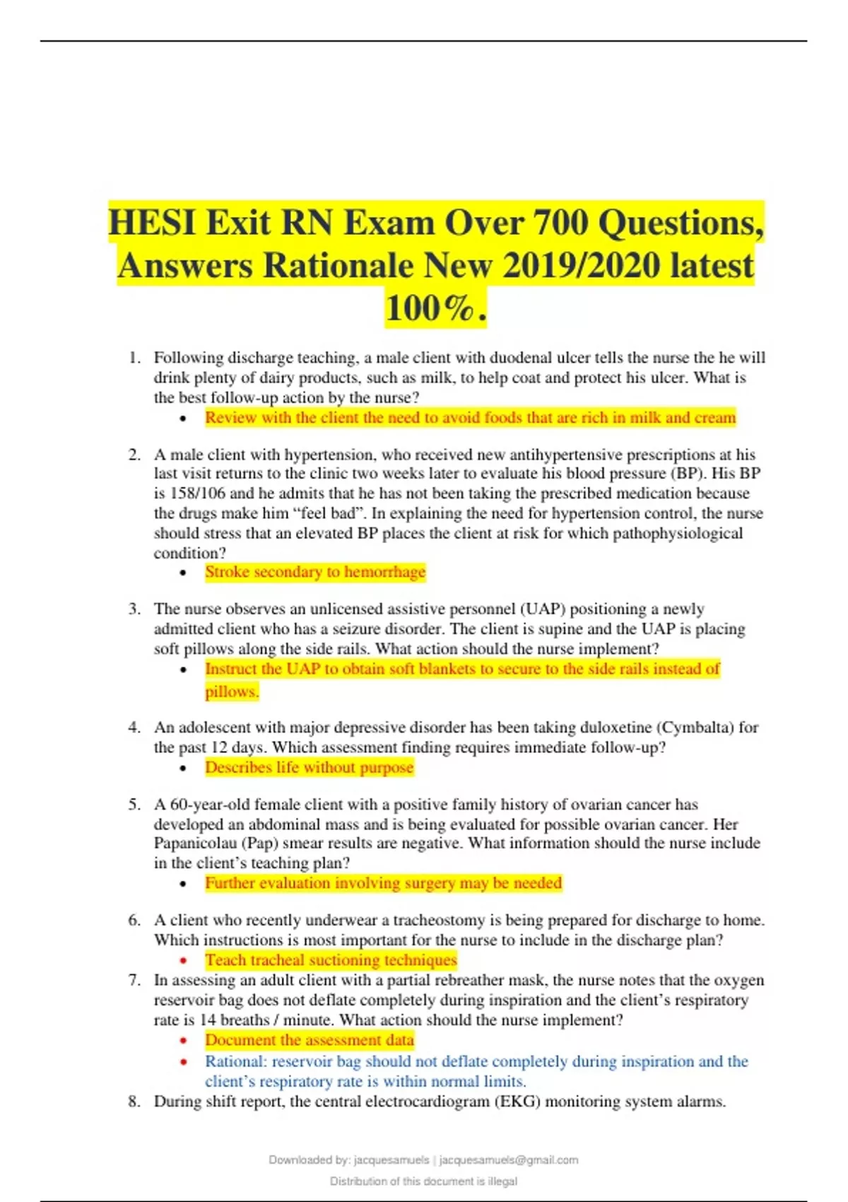 HESI Exit RN Exam Over 700 Questions, Answers Rationale New 2019/2020 latest 100%. 1. Following discharge teaching, a male client with duodenal ulcer tells the nurse the he will drink plenty of dairy products, such as milk, to help coat and protect his ulcer. What is the best follow-up action by the nurse? • Review with the client the need to avoid foods that are rich in milk and cream 2. A male client with hypertension, who received new antihypertensive prescriptions at his last visit returns to the clinic two weeks later to evaluate his blood pressure (BP). His BP is 158/106 and he admits that he has not been taking the prescribed medication because the drugs make him “feel bad”. In explaining the need for hypertension control, the nurse should stress that an elevated BP places the client at risk for which pathophysiological condition? • Stroke secondary to hemorrhage 3. The nurse observes an unlicensed assistive personnel (UAP) positioning a newly admitted client who has a seizure disorder. The client is supine and the UAP is placing soft pillows along the side rails. What action should the nurse implement? • Instruct the UAP to obtain soft blankets to secure to the side rails instead of pillows. 4. An adolescent with major depressive disorder has been taking duloxetine (Cymbalta) for the past 12 days. Which assessment finding requires immediate follow-up? • Describes life without purpose 5. A 60-year-old female client with a positive family history of ovarian cancer has developed an abdominal mass and is being evaluated for possible ovarian cancer. Her Papanicolau (Pap) smear results are negative. What information should the nurse include in the client’s teaching plan? • Further evaluation involving surgery may be needed 6. A client who recently underwear a tracheostomy is being prepared for discharge to home. Which instructions is most important for the nurse to include in the discharge plan? • Teach tracheal suctioning techniques 7. In assessing an adult client with a partial rebreather mask, the nurse notes that the oxygen reservoir bag does not deflate completely during inspiration and the client’s respiratory rate is 14 breaths / minute. What action should the nurse implement? • Document the assessment data • Rational: reservoir bag should not deflate completely during inspiration and the client’s respiratory rate is within normal limits. 8. During shift report, the central electrocardiogram (EKG) monitoring system alarms. Which client alarm should the nurse investigate firs? • Respiratory apnea of 30 seconds 9. During a home visit, the nurse observed an elderly client with diabetes slip and fall. What action should the nurse take first? • Check the client for lacerations or fractures 10. At 0600 while admitting a woman for a schedule repeat cesarean section (C-Section), the client tells the nurse that she drank a cup a coffee at 0400 because she wanted to avoid getting a headache. Which action should the nurse take first? • Inform the anesthesia care provider 11. After placing a stethoscope as seen in the picture, the nurse auscultates S1 and S2 heart sounds. To determine if an S3 heart sound is present, what action should the nurse take first? • Listen with the bell at the same location 12. A 66-year-old woman is retiring and will no longer have a health insurance through her place of employment. Which agency should the client be referred to by the employee health nurse for health insurance needs? • Medicare 13. A client who is taking an oral dose of a tetracycline complains of gastrointestinal upset. What snack should the nurse instruct the client to take with the tetracycline? • Toasted wheat bread and jelly 14. Following a lumbar puncture, a client voices several complaints. What complaint indicated to the nurse that the client is experiencing a complication? • “I have a headache that gets worse when I sit up” • “I am having pain in my lower back when I move my legs” • “My throat hurts when I swallow” • “I feel sick to my stomach and am going to throw up” 15. An elderly client seems confused and reports the onset of nausea, dysuria, and urgency with incontinence. Which action should the nurse implement? • Obtain a clean catch mid-stream specimen 16. The nurse is assisting the mother of a child with phenylketonuria (PKU) to select foods that are in keeping with the child’s dietary restrictions. Which foods are contraindicated for this child? • Foods sweetened with aspartame 17. Before preparing a client for the first surgical case of the day, a part-time scrub nurse asks the circulating nurse if a 3 minute surgical hand scrub is adequate preparation for this client. Which response should the circulating nurse provide? • Direct the nurse to continue the surgical hand scrub for a 5 minute duration 18. Which breakfast selection indicates that the client understands the nurse’s instructions about the dietary management of osteoporosis? • Bagel with jelly and skim milk 19. The charge nurse of a critical care unit is informed at the beginning of the shift that less than the optimal number of registered nurses will be working that shift. In planning assignments, which client should receive the most care hours by a registered nurse (RN)? • An 82-year-old client with Alzheimer’s disease newly-fractures femur who has a Foley catheter and soft wrist restrains applied 20. A mother brings her 6-year-old child, who has just stepped on a rusty nail, to the pediatrician’s office. Upon inspection, the nurse notes that the nail went through the shoe and pierced the bottom of the child’s foot. Which action should the nurse implement first? • Cleanse the foot with soap and water and apply an antibiotic ointment • Provide teaching about the need for a tetanus booster within the next 72 hours. • have the mother check the child's temperature q4h for the next 24 hours • transfer the child to the emergency depa