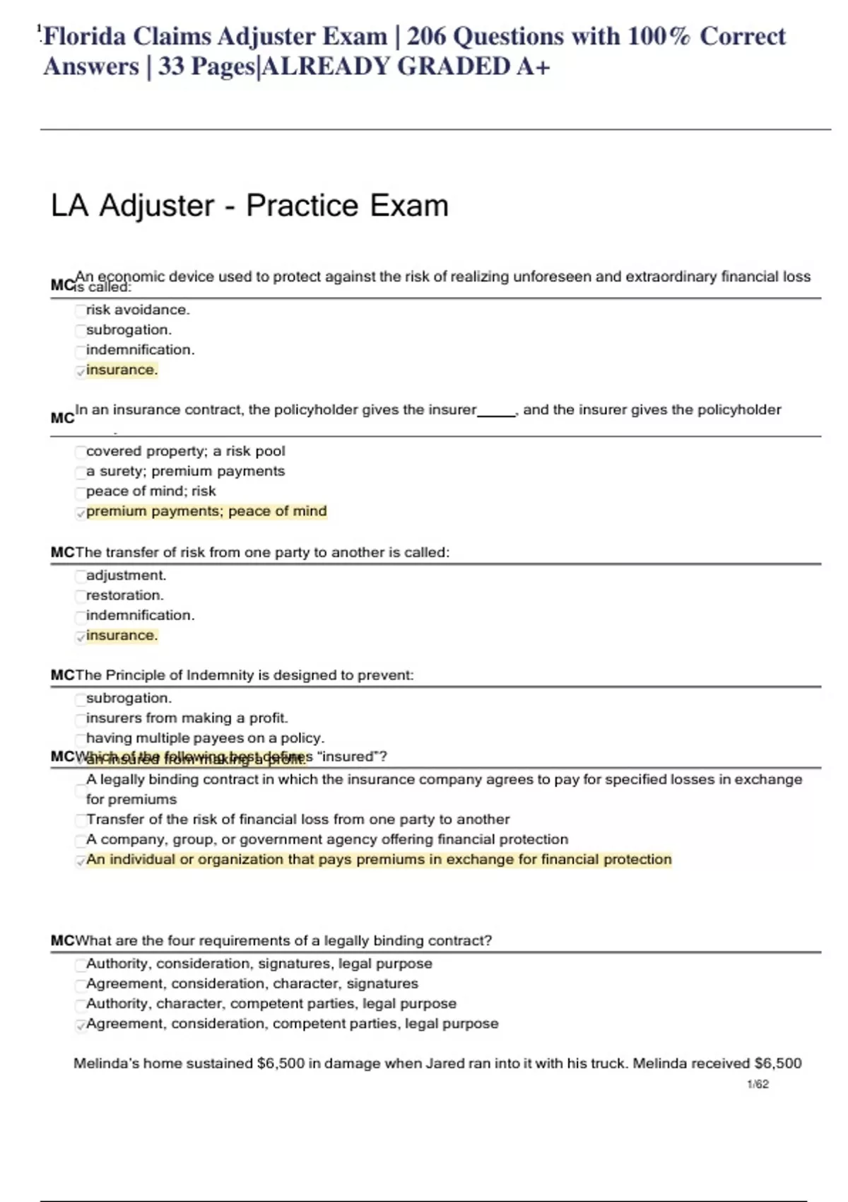 Florida Claims Adjuster Exam | 206 Questions with 100% Correct Answers | 33 Pages|ALREADY GRADED A+