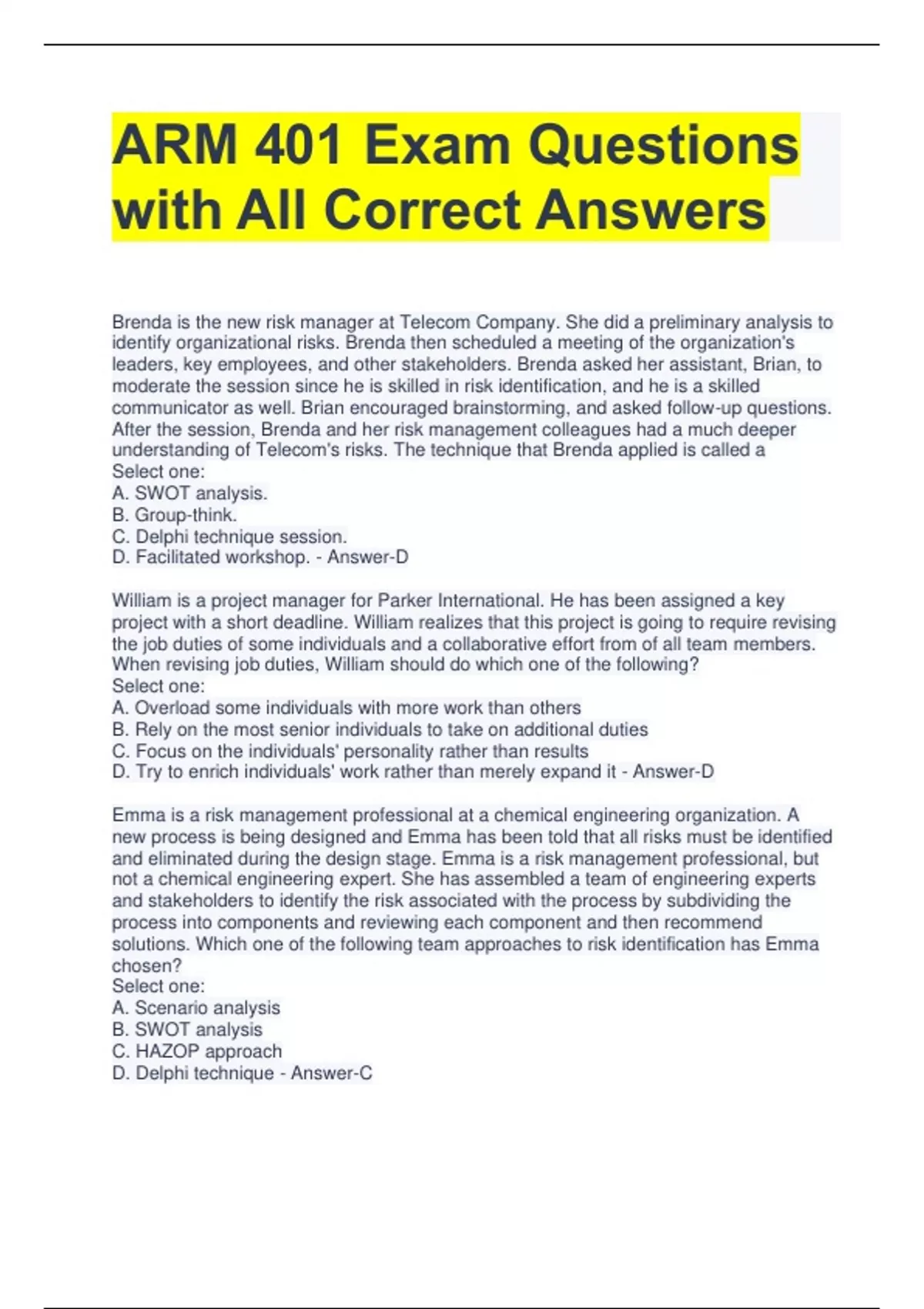 ARM 401 Exam Questions with All Correct Answers Brenda is the new risk manager at Telecom Company. She did a preliminary analysis to identify organizational risks. Brenda then scheduled a meeting of the organization's leaders, key employees, and other stakeholders. Brenda asked her assistant, Brian, to moderate the session since he is skilled in risk identification, and he is a skilled communicator as well. Brian encouraged brainstorming, and asked follow-up questions. After the session, Brenda and her risk management colleagues had a much deeper understanding of Telecom's risks. The technique that Brenda applied is called a Select one: A. SWOT analysis. B. Group-think. C. Delphi technique session. D. Facilitated workshop. - Answer-D William is a project manager for Parker International. He has been assigned a key project with a short deadline. William realizes that this project is going to require revising the job duties of some individuals and a collaborative effort from of all team members. When revising job duties, William should do which one of the following? Select one: A. Overload some individuals with more work than others B. Rely on the most senior individuals to take on additional duties C. Focus on the individuals' personality rather than results D. Try to enrich individuals' work rather than merely expand it - Answer-D Emma is a risk management professional at a chemical engineering organization. A new process is being designed and Emma has been told that all risks must be identified and eliminated during the design stage. Emma is a risk management professional, but not a chemical engineering expert. She has assembled a team of engineering experts and stakeholders to identify the risk associated with the process by subdividing the process into components and reviewing each component and then recommend solutions. Which one of the following team approaches to risk identification has Emma chosen? Select one: A. Scenario analysis B. SWOT analysis C. HAZOP approach D. Delphi technique - Answer-C Which one of the following risk assessment tools has the potential to identify both negative risks and opportunity risks? Select one: A. Risk maps B. Cause and effect analysis C. Failure mode and effects analysis D. Audits - Answer-D