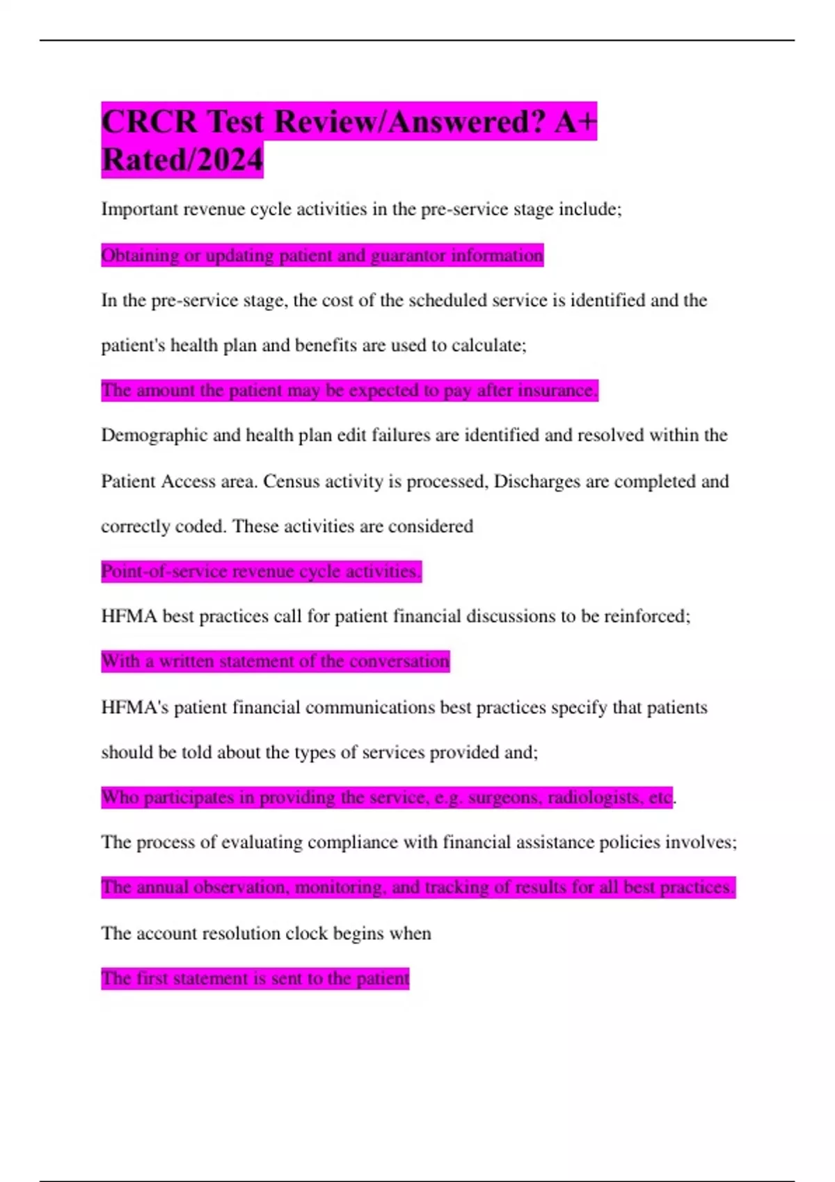 CRCR Test Review/Answered/ A+ Rated/2024 Important revenue cycle activities in the pre-service stage include; In the pre-service stage, the cost of the scheduled service is identified and the patient's health plan and benefits are used to calculate;