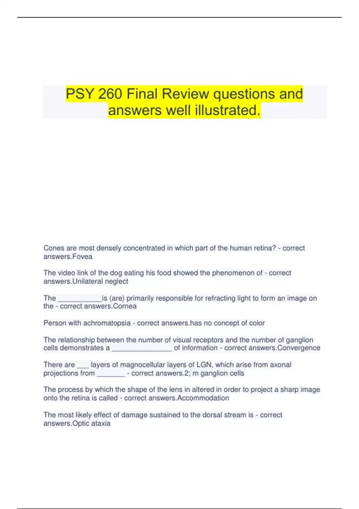 PSY 260 Final Review questions and answers well illustrated. Cones are most densely concentrated in which part of the human retina? - correct answers.Fovea The video link of the dog eating his food showed the phenomenon of - correct answers.Unilateral neglect The ___________is (are) primarily responsible for refracting light to form an image on the - correct answers.Cornea Person with achromatopsia - correct no concept of color The relationship between the number of visual receptors and the number of ganglion cells demonstrates a _______________ of information - correct answers.Convergence There are ___ layers of magnocellular layers of LGN, which arise from axonal projections from _______ - correct answers.2; m ganglion cells The process by which the shape of the lens in altered in order to project a sharp image onto the retina is called - correct answers.Accommodation The most likely effect of damage sustained to the dorsal stream is - correct answers.Optic ataxia