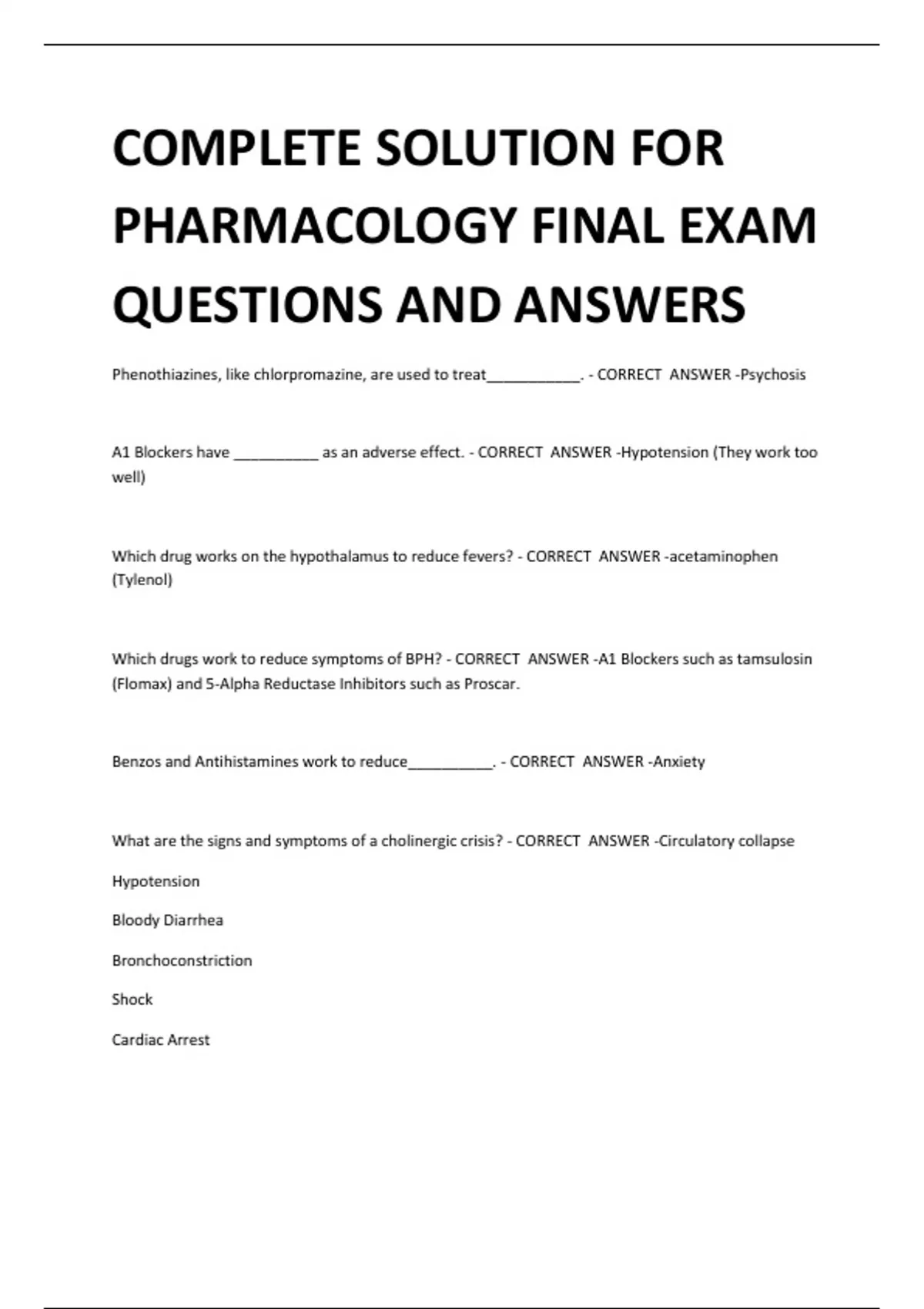COMPLETE SOLUTION FOR PHARMACOLOGY FINAL EXAM QUESTIONS AND ANSWERS Phenothiazines, like chlorpromazine, are used to treat___________. - CORRECT ANSWER -Psychosis A1 Blockers have __________ as an adverse effect. - CORRECT ANSWER -Hypotension (They work too well) Which drug works on the hypothalamus to reduce fevers? - CORRECT ANSWER -acetaminophen (Tylenol) Which drugs work to reduce symptoms of BPH? - CORRECT ANSWER -A1 Blockers such as tamsulosin (Flomax) and 5-Alpha Reductase Inhibitors such as Proscar. Benzos and Antihistamines work to reduce__________. - CORRECT ANSWER -Anxiety What are the signs and symptoms of a cholinergic crisis? - CORRECT ANSWER -Circulatory collapse Hypotension Bloody Diarrhea Bronchoconstriction Shock Cardiac Arrest Clients with asthma or COPD should not receive __________________________. - CORRECT ANSWER Non-selective Beta Blockers Hydroxzine hydrochloride (Atarax), Hydroxine pamoate (Vistaril) and diphenhydramine (Benadryl) are all ______________________ and are used to treat ______________. - CORRECT ANSWER -Antihistamines Anxiety Three catchecolamines are : - CORRECT ANSWER -Epinephrine Norepinephrine Dopamine B1 Beta Adrenergic Receptors are located in________. - CORRECT ANSWER -The Heart--When it comes to Beta Receptors remember: You have ONE heart and TWO lungs. Beta1 works in the heart and Beta2 works in the lungs. Cholinergic drugs mimic the ________ response which is __________ or __________ . - CORRECT ANSWER -Parasympathetic rest digest Beta blocker drugs all end in what three letters? - CORRECT ANSWER -LOL Propranololol, atenolol, carvedilol Non-Benzos like Ambien can have ___________ as an adverse effect. - CORRECT ANSWER somnabulation (Sleep walking) The dopaminergic drug for Parkinson's disease is _____________' - CORRECT ANSWER -carbidalevodopa (Sinemet)