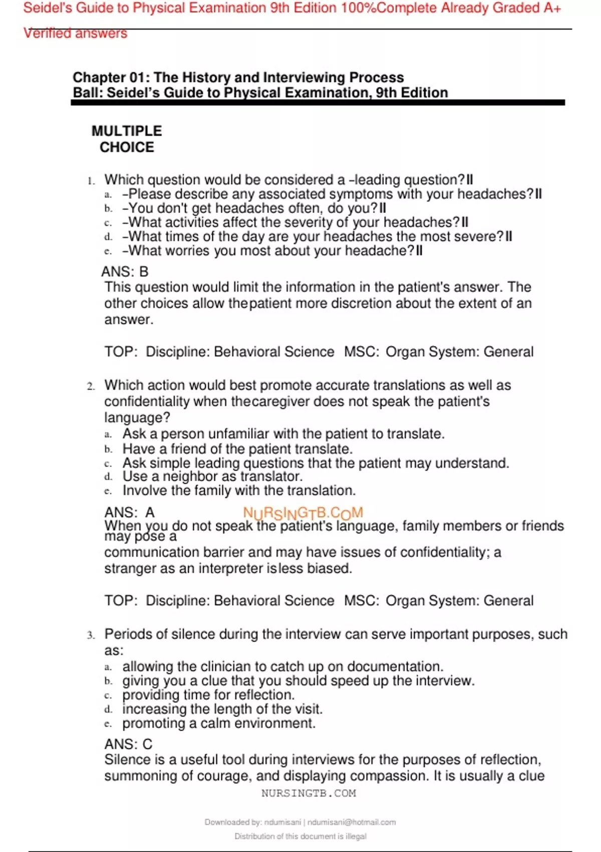 Seidel's Guide to Physical Examination 9th Edition 100%Complete Already Graded A+ Verified answers Chapter 01: The History and Interviewing Process Ball: Seidel’s Guide to Physical Examination, 9th Edition MULTIPLE CHOICE 1. Which question would be considered a ―leading question?‖ a. ―Please describe any associated symptoms with your headaches?‖ b. ―You don't get headaches often, do you?‖ c. ―What activities affect the severity of your headaches?‖ d. ―What times of the day are your headaches the most severe?‖ e. ―What worries you most about your headache?‖ ANS: B This question would limit the information in the patient's answer. The other choices allow thepatient more discretion about the extent of an answer. TOP: Discipline: Behavioral Science MSC: Organ System: General 2. Which action would best promote accurate translations as well as confidentiality when thecaregiver does not speak the patient's language? a. Ask a person unfamiliar with the patient to translate. b. Have a friend of the patient translate. c. Ask simple leading questions that the patient may understand. d. Use a neighbor as translator. e. Involve the family with the translation. ANS: A NURSINGTB.COM When you do not speak the patient's language, family members or friends may pose a communication barrier and m
