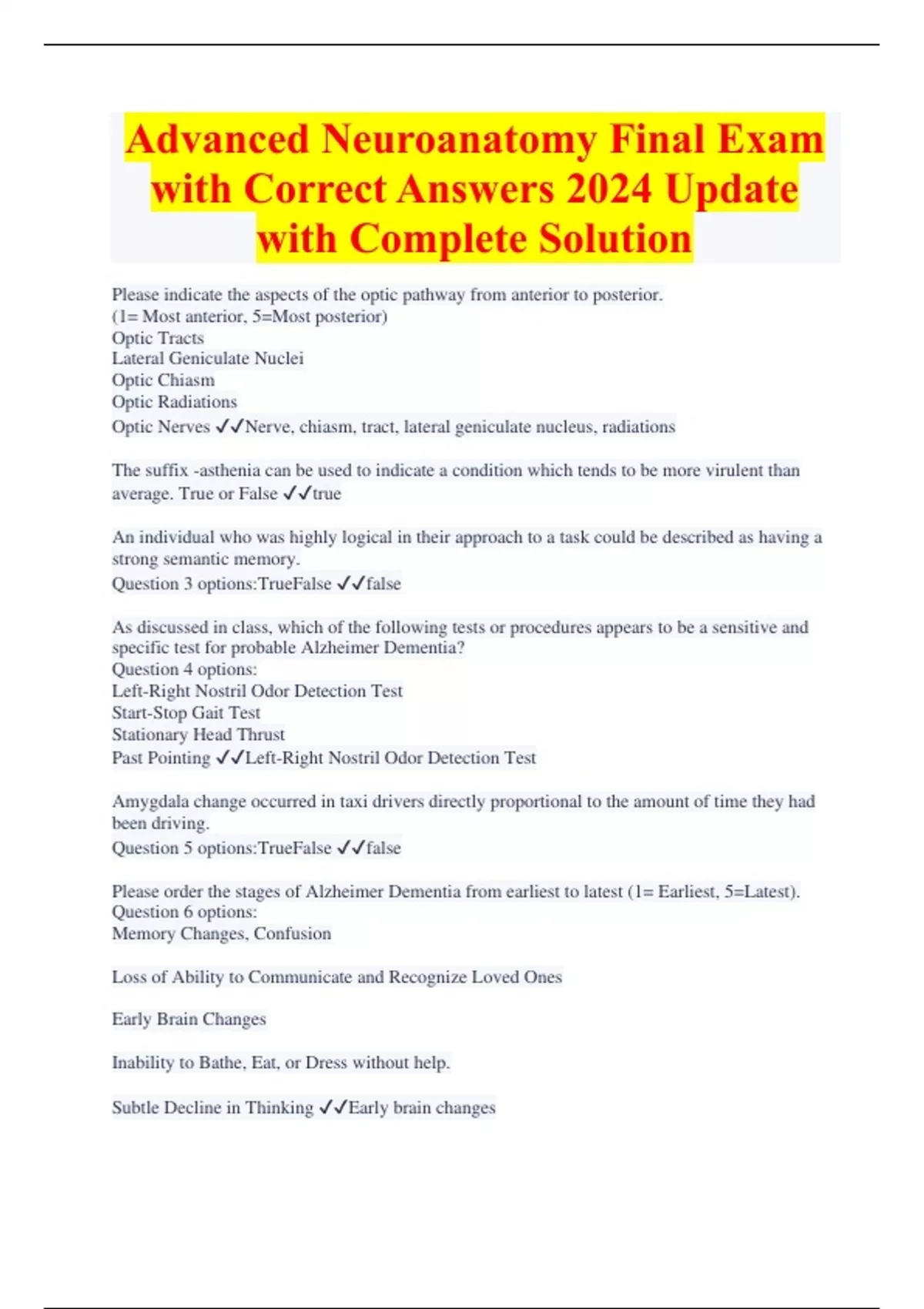 Advanced Neuroanatomy Final Exam with Correct Answers 2024 Update with Complete Solution Please indicate the aspects of the optic pathway from anterior to posterior. (1= Most anterior, 5=Most posterior) Optic Tracts Lateral Geniculate Nuclei Optic Chiasm Optic Radiations Optic Nerves Nerve, chiasm, tract, lateral geniculate nucleus, radiations The suffix -asthenia can be used to indicate a condition which tends to be more virulent than average. True or False true An individual who was highly logical in their approach to a task could be described as having a strong semantic memory. Question 3 options:TrueFalse false As discussed in class, which of the following tests or procedures appears to be a sensitive and specific test for probable Alzheimer Dementia? Question 4 options: Left-Right Nostril Odor Detection Test Start-Stop Gait Test Stationary Head Thrust Past Pointing Left-Right Nostril Odor Detection Test Amygdala change occurred in taxi drivers directly proportional to the amount of time they had been driving. Question 5 options:TrueFalse false Please order the stages of Alzheimer Dementia from earliest to latest (1= Earliest, 5=Latest). Question 6 options: Memory Changes, Confusion