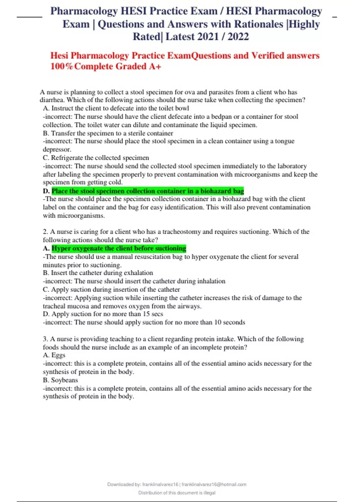 Hesi Pharmacology Practice ExamQuestions and Verified answers 100%Complete Graded A+ A nurse is planning to collect a stool specimen for ova and parasites from a client who has diarrhea. Which of the following actions should the nurse take when collecting the specimen? A. Instruct the client to defecate into the toilet bowl -incorrect: The nurse should have the client defecate into a bedpan or a container for stool collection. The toilet water can dilute and contaminate the liquid specimen. B. Transfer the specimen to a sterile container -incorrect: The nurse should place the stool specimen in a clean container using a tongue depressor. C. Refrigerate the collected specimen -incorrect: The nurse should send the collected stool specimen immediately to the laboratory after labeling the specimen properly to prevent contamination with microorganisms and keep the specimen from getting cold. D. Place the stool specimen collection container in a biohazard bag -The nurse should place the specimen collection container in a biohazard bag with the client label on the container and the bag for easy identification. This will also prevent contamination with microorganisms. 2. A nurse is caring for a client who has a tracheostomy and requires suctioning. Which of the following actions should the nurse take? A. Hyper oxygenate the client before suctioning -The nurse should use a manual resuscitation bag to hyper oxygenate the client for several minutes prior to suctioning. B. Insert the catheter during exhalation -incorrect: The nurse should insert the catheter during inhalation C. Apply suction during insertion of the catheter -incorrect: Applying suction while inserting the catheter increases the risk of damage to the tracheal mucosa and removes oxygen from the airways. D. Apply suction for no more than 15 secs -incorrect: The nurse should apply suction for no more than 10 seconds 3. A nurse is providing teaching to a client regarding protein intake. Which of the following foods should the nurse include as an example o