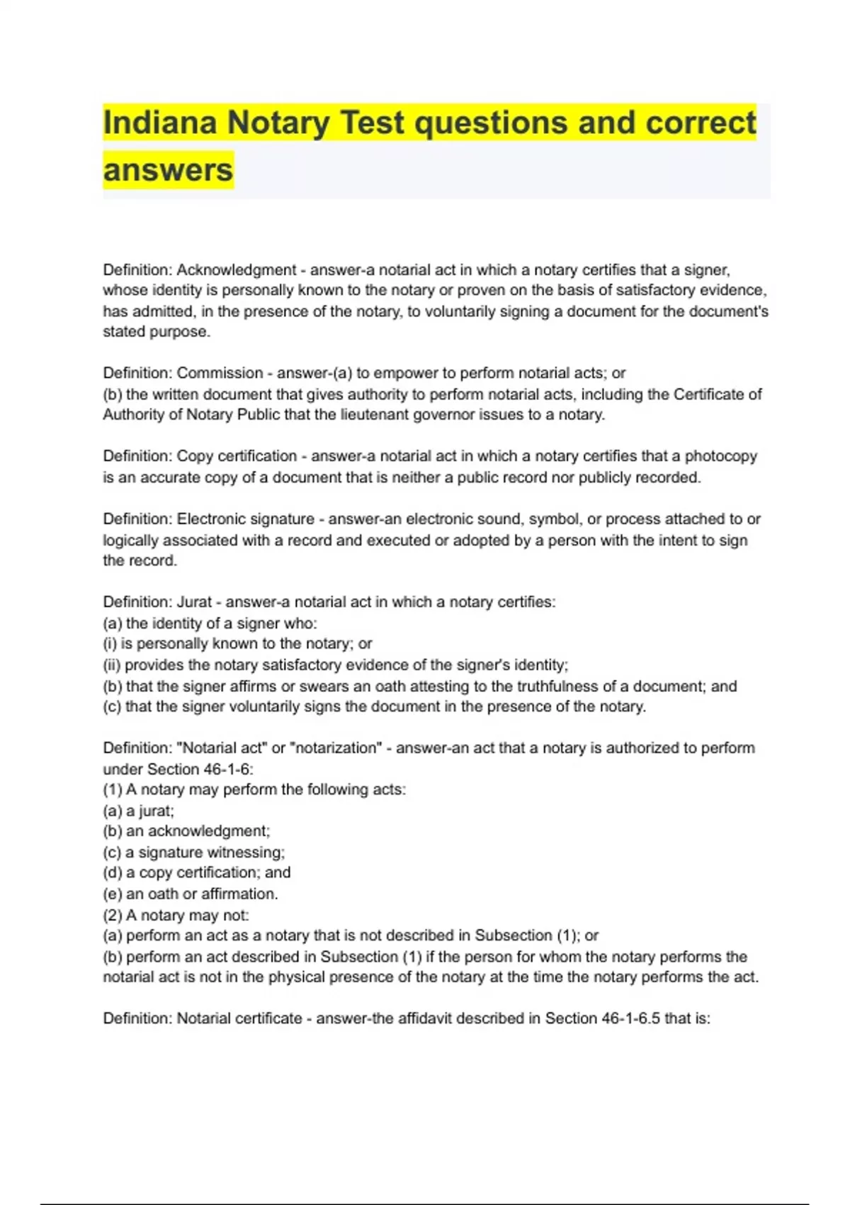 Indiana Notary Test questions and correct answers