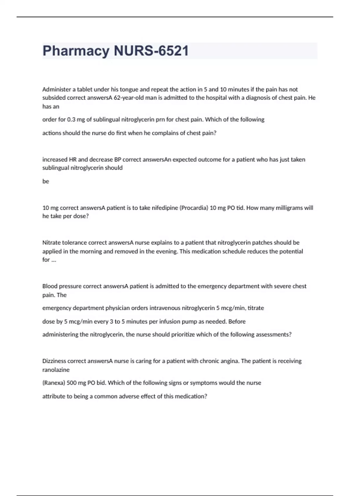 Administer a tablet under his tongue and repeat the action in 5 and 10 minutes if the pain has not subsided correct answersA 62-year-old man is admitted to the hospital with a diagnosis of chest pain. He has an order for 0.3 mg of sublingual nitroglycerin prn for chest pain. Which of the following actions should the nurse do first when he complains of chest pain? increased HR and decrease BP correct answersAn expected outcome for a patient who has just taken sublingual nitroglycerin should be 10 mg correct answersA patient is to take nifedipine (Procardia) 10 mg PO tid. How many milligrams will he take per dose? Nitrate tolerance correct answersA nurse explains to a patient that nitroglycerin patches should be applied in the morning and removed in the evening. This medication schedule reduces the potential for ... Blood pressure correct answersA patient is admitted to the emergency department with severe chest pain. The emergency department physician orders intravenous nitroglycerin 5 mcg/min, titrate dose by 5 mcg/min every 3 to 5 minutes per infusion pump as needed. Before administering the nitroglycerin, the nurse should prioritize which of the following assessments? Dizziness correct answersA nurse is caring for a patient with chronic angina. The patient is receiving ranolazine (Ranexa) 500 mg PO bid. Which of the following signs or symptoms would the nurse attribute to being a common adverse effect of this medication?