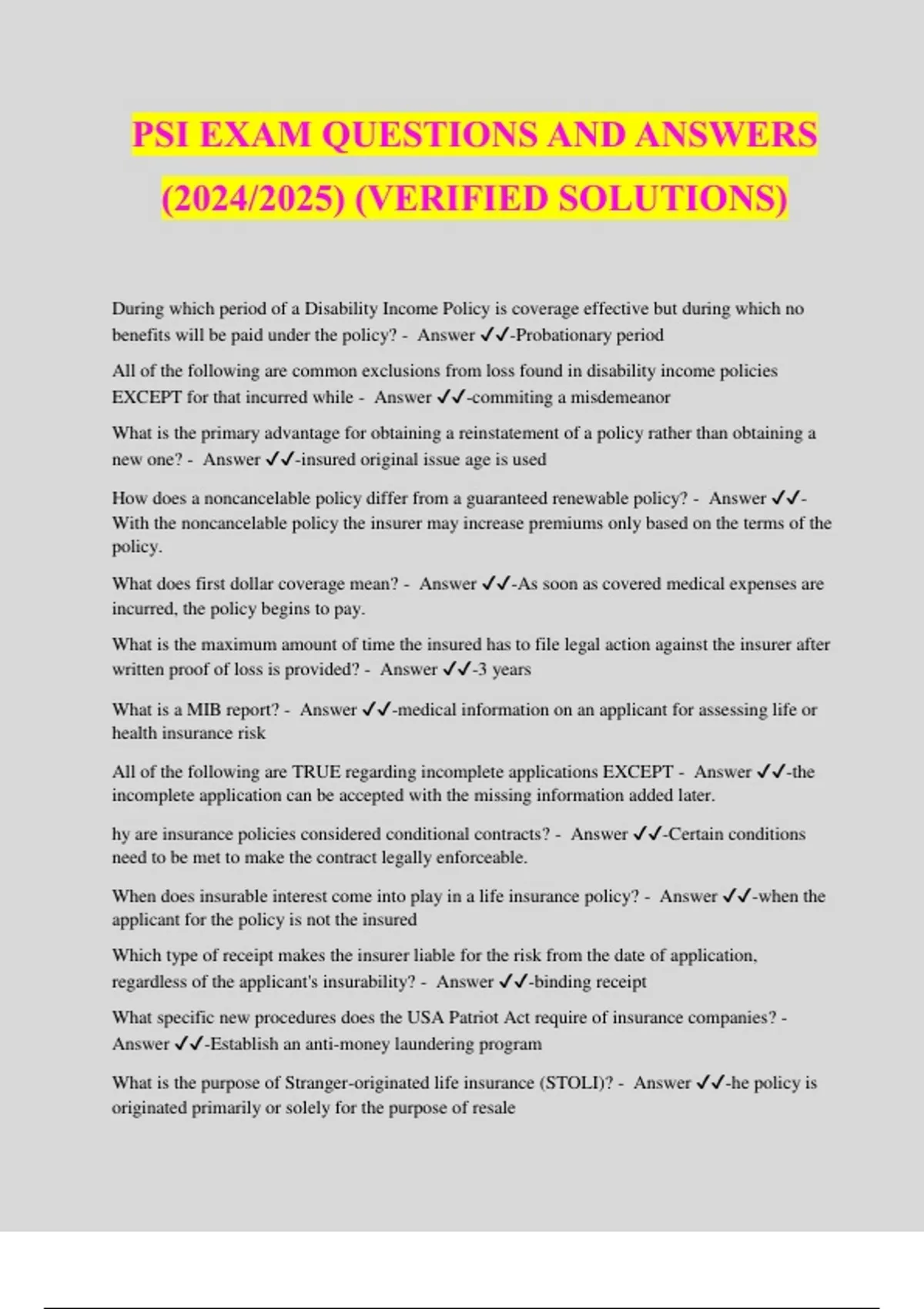 PSI EXAM QUESTIONS AND ANSWERS (2024/2025) (VERIFIED SOLUTIONS) During which period of a Disability Income Policy is coverage effective but during which no benefits will be paid under the policy? - Answer ️️ -Probationary period All of the following are common exclusions from loss found in disability income policies EXCEPT for that incurred while - Answer ️️ -commiting a misdemeanor What is the primary advantage for obtaining a reinstatement of a policy rather than obtaining a new one? - Answer ️️ -insured original issue age is used How does a noncancelable policy differ from a guaranteed renewable policy? - Answer ️️ - With the noncancelable policy the insurer may increase premiums only based on the terms of the policy. What does first dollar coverage mean? - Answer ️️ -As soon as covered medical expenses are incurred, the policy begins to pay. What is the maximum amount of time the insured has to file legal action against the insurer after written proof of loss is provided? - Answer ️️ -3 years What is a MIB report? - Answer ️️ -medical information on an applicant for assessing life or health insurance risk All of the following are TRUE regarding incomplete applications EXCEPT - Answer ️️ -the incomplete application can be accepted with the missing information added later. hy are insurance policies considered conditional contracts? - Answer ️️ -Certain conditions need to be met to make the contract legally enforceable. When does insurable interest come into play in a life insurance policy? - Answer ️️ -when the applicant for the policy is not the insured Which type of receipt makes the insurer liable for the risk from the date of application, regardless of the applicant's insurability? - Answer ️️ -binding receipt What specific new procedures does the USA Patriot Act require of insurance companies? - Answer ️️ -Establish an anti-money laundering program What is the purpose of Stranger-originated life insurance (STOLI)? - Answer ️️ -he policy is originated primarily or solely for the purpose of resale