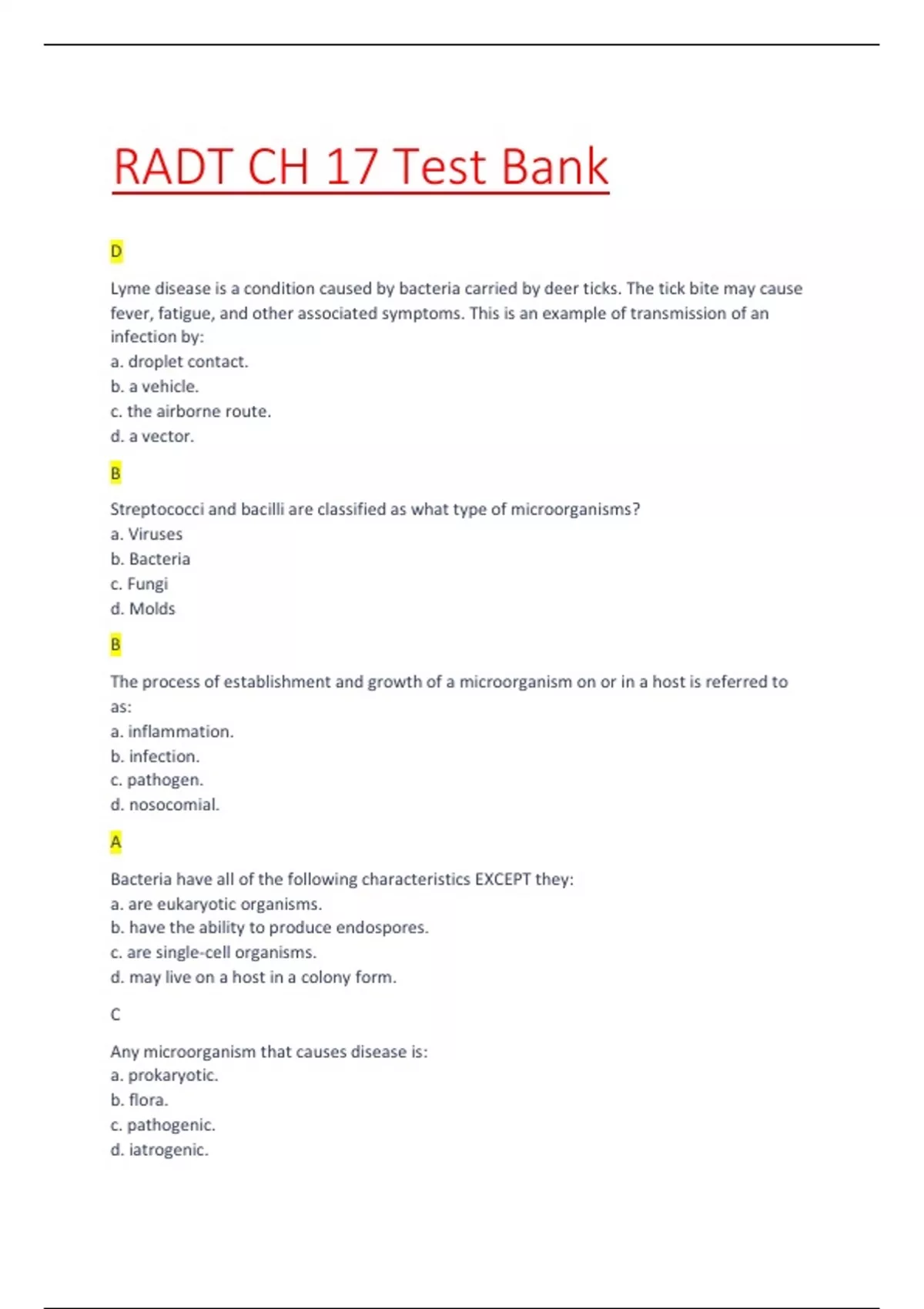 B Streptococci and bacilli are classified as what type of microorganisms? a. Viruses b. Bacteria c. Fungi d. Molds B The process of establishment and growth of a microorganism on or in a host is referred to as: a. inflammation. b. infection. c. pathogen. d. nosocomial. A Bacteria have all of the following characteristics EXCEPT they: a. are eukaryotic organisms. b. have the ability to produce endospores. c. are single-cell organisms. d. may live on a host in a colony form. C Any microorganism that causes disease is: a. prokaryotic. b. flora. c. pathogenic. d. iatrogenic.