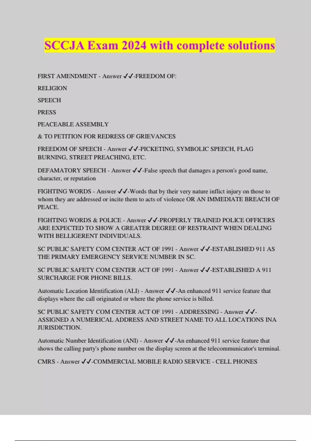 SCCJA Exam 2024 with complete solutions FIRST AMENDMENT - Answer ️️ -FREEDOM OF: RELIGION SPEECH PRESS PEACEABLE ASSEMBLY & TO PETITION FOR REDRESS OF GRIEVANCES FREEDOM OF SPEECH - Answer ️️ -PICKETING, SYMBOLIC SPEECH, FLAG BURNING, STREET PREACHING, ETC. DEFAMATORY SPEECH - Answer ️️ -False speech that damages a person's good name, character, or reputation FIGHTING WORDS - Answer ️️ -Words that by their very nature inflict injury on those to whom they are addressed or incite them to acts of violence OR AN IMMEDIATE BREACH OF PEACE. FIGHTING WORDS & POLICE - Answer ️️ -PROPERLY TRAINED POLICE OFFICERS ARE EXPECTED TO SHOW A GREATER DEGREE OF RESTRAINT WHEN DEALING WITH BELLIGERENT INDIVIDUALS. SC PUBLIC SAFETY COM CENTER ACT OF 1991 - Answer ️️ -ESTABLISHED 911 AS THE PRIMARY EMERGENCY SERVICE NUMBER IN SC. SC PUBLIC SAFETY COM CENTER ACT OF 1991 - Answer ️️ -ESTABLISHED A 911 SURCHARGE FOR PHONE BILLS. Automatic Location Identification (ALI) - Answer ️️ -An enhanced 911 service feature that displays where the call originated or where the phone service is billed. SC PUBLIC SAFETY COM CENTER ACT OF 1991 - ADDRESSING - Answer ️️ - ASSIGNED A NUMERICAL ADDRESS AND STREET NAME TO ALL LOCATIONS INA JURISDICTION. Automatic Number Identification (ANI) - Answer ️️ -An enhanced 911 service feature that shows the calling party's phone number on the display screen at the telecommunicator's terminal. CMRS - Answer ️️ -COMMERCIAL MOBILE RADIO SERVICE - CELL PHONES Public Safety Answering Point (PSAP) - Answer ️️ -Any location or facility at which 9-1-1 calls are answered either by direct calling, rerouting, or diversion. PUBLIC SAFETY AGENT - Answer ️️ -FUNCTIONAL AGENCY THAT PROVIDES FIRE, EMS, OR LAW ENFORCEMENT SVCS. 80% - Answer ️️ -PERCENTAGE OF LINES THAT MUST BE ANSWERED WITHIN 10 SECONDS PER SC LAW. 2 LINES - Answer ️️ -MINIMUM NUMBER OF LINES A PSAP MUST HAVE. 60 DAYS - Answer ️️ -MINIMUM NUMBER OF DAYS A PSAP MUST SAVE RECORDINGS. 1 LINE - Answer ️️ -MINIMUM NUMBER OF LINES THAT MUST HAVE TTY OR TDD PER SC LAW. IMMEDIATE PLAYBACK - Answer ️️ -RECORDINGS MUST HAVE... SC PUBLIC SAFETY COM CENTER ACT OF 1991 - Answer ️️ -THIS ACT ESTABLISHED MINIMUM GUIDELINES FOR 911 CENTERS IN SC. SC PUBLIC SAFETY COM CENTER ACT OF 1991 - Answer ️️ -TELCOMS MUST BE CERTIFIED BY THE LAW ENFORCEMENT TRAINING COUNCIL SC PUBLIC SAFETY COM CENTER ACT OF 1991 - Answer ️️ -PSAPS MUST HAVE NON EMERGENCY LINES AS WELL SC PUBLIC SAFETY COM CENTER ACT OF 1991 - Answer ️️ -COIN FREE DIALING REQUIREMENT SC PUBLIC SAFETY COM CENTER ACT OF 1991 - Answer ️️ -SECONDARY BACK UP NUMBER FOR EMERGENCY CALLS SC PUBLIC SAFETY COM CENTER ACT OF 1991 - Answer ️️ -PUBLIC EDUCATION AND OUTREACH. $200 - Answer ️️ -FINE FOR NOT HAVING 3 INCH NUMBERS ON YOUR HOUSE OR AT THE STREET, IF THE HOUSE IS MORE THAN 50 FEET FROM THE ROAD. DUPLICATE ADDRESSES - Answer ️️ -EXISTING STREET NAMES WHICH ARE THE SAME IN A JURISDICTION NEED TO BE CHANGED IF THEY HAVE THE SAME ADDRESS BECAUSE SC PUBLIC SAFETY COM CENTER ACT OF 1991 DOES NOT ALLOW - SC PUBLIC SAFETY COM CENTER ACT OF 1991 - Answer ️️ -NEW STREET NAMES MAY NOT DUPLICATE EXISTING ONES IN THE SAME JURISDICTION. SC ETHICS REFORM ACT OF 1991 - Answer ️️ -PUBLIC EMPLOYEES CAN'T RECEIVE ANYTHING OF VALUE ANYTHING OF VALUE - Answer ️️ -MONEY, BANK BILL, PROMISSORY NOTE ART, ANTIQUE, AUTOMOBILE PROMISE OF EMPLOYMENT TITLE TO REAL ESTATE ANYTHING OF VALUE DOES NOT MEAN - Answer ️️ -PROMOTIONAL ITEMS LESS THAN $10. A TROPHY OR PLAQUE LESS THAN $150. ANYTHING OF VALUE DOES NOT MEAN - Answer ️️ -EDUCATIONAL MATERIAL DIRECTLY RELATED TO THE OFFICIAL'S RESPONSIBILITIES ANYTHING OF VALUE DOES NOT MEAN - Answer ️️ -HONORARY DEGREE ANYTHING OF VALUE DOES NOT MEAN - Answer ️️ -PROMOTIONAL ITEMS GIVEN TO THE OFFICIAL ON THE SAME TERMS THEY ARE GIVEN TO THE GENERAL PUBLIC. ANYTHING OF VALUE DOES NOT MEAN - Answer ️️ -CAMPAIGN CONTRIBUTIONS THAT ARE PROPERLY DISCLOSED. FCC REGULATIONS - Answer ️️ -TELECOMMUNICATORS ARE NOT REQUIRED TO HAVE AN FCC RADIO LICENS
