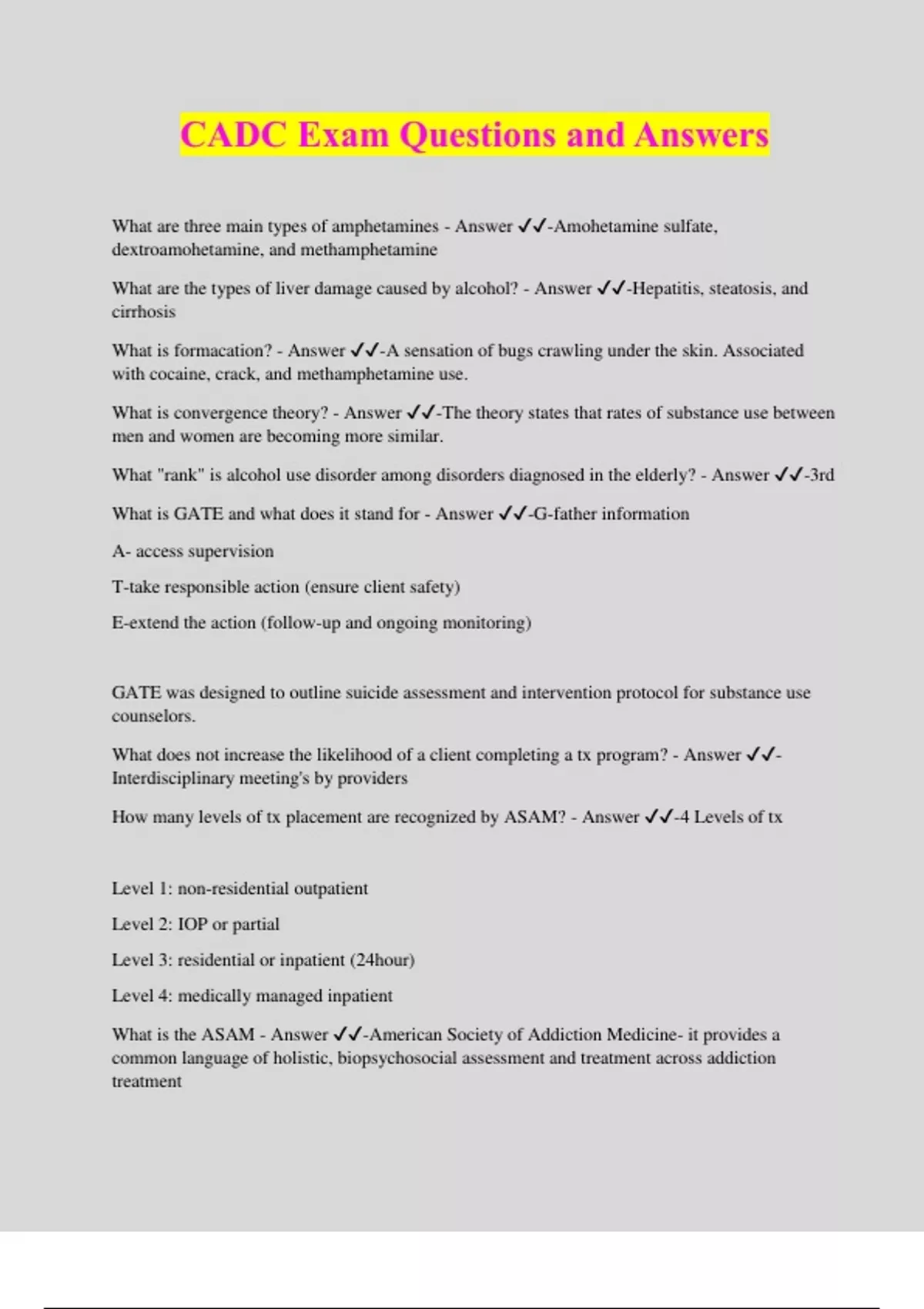 CADC Exam Questions and Answers What are three main types of amphetamines - Answer ️️ -Amohetamine sulfate, dextroamohetamine, and methamphetamine What are the types of liver damage caused by alcohol? - Answer ️️ -Hepatitis, steatosis, and cirrhosis What is formacation? - Answer ️️ -A sensation of bugs crawling under the skin. Associated with cocaine, crack, and methamphetamine use. What is convergence theory? - Answer ️️ -The theory states that rates of substance use between men and women are becoming more similar. What "rank" is alcohol use disorder among disorders diagnosed in the elderly? - Answer ️️ -3rd What is GATE and what does it stand for - Answer ️️ -G-father information A- access supervision T-take responsible action (ensure client safety) E-extend the action (follow-up and ongoing monitoring) GATE was designed to outline suicide assessment and intervention protocol for substance use counselors. What does not increase the likelihood of a client completing a tx program? - Answer ️️ - Interdisciplinary meeting's by providers How many levels of tx placement are recognized by ASAM? - Answer ️️ -4 Levels of tx Level 1: non-residential outpatient Level 2: IOP or partial Level 3: residential or inpatient (24hour) Level 4: medically managed inpatient What is the ASAM - Answer ️️ -American Society of Addiction Medicine- it provides a common language of holistic, biopsychosocial assessment and treatment across addiction treatmen
