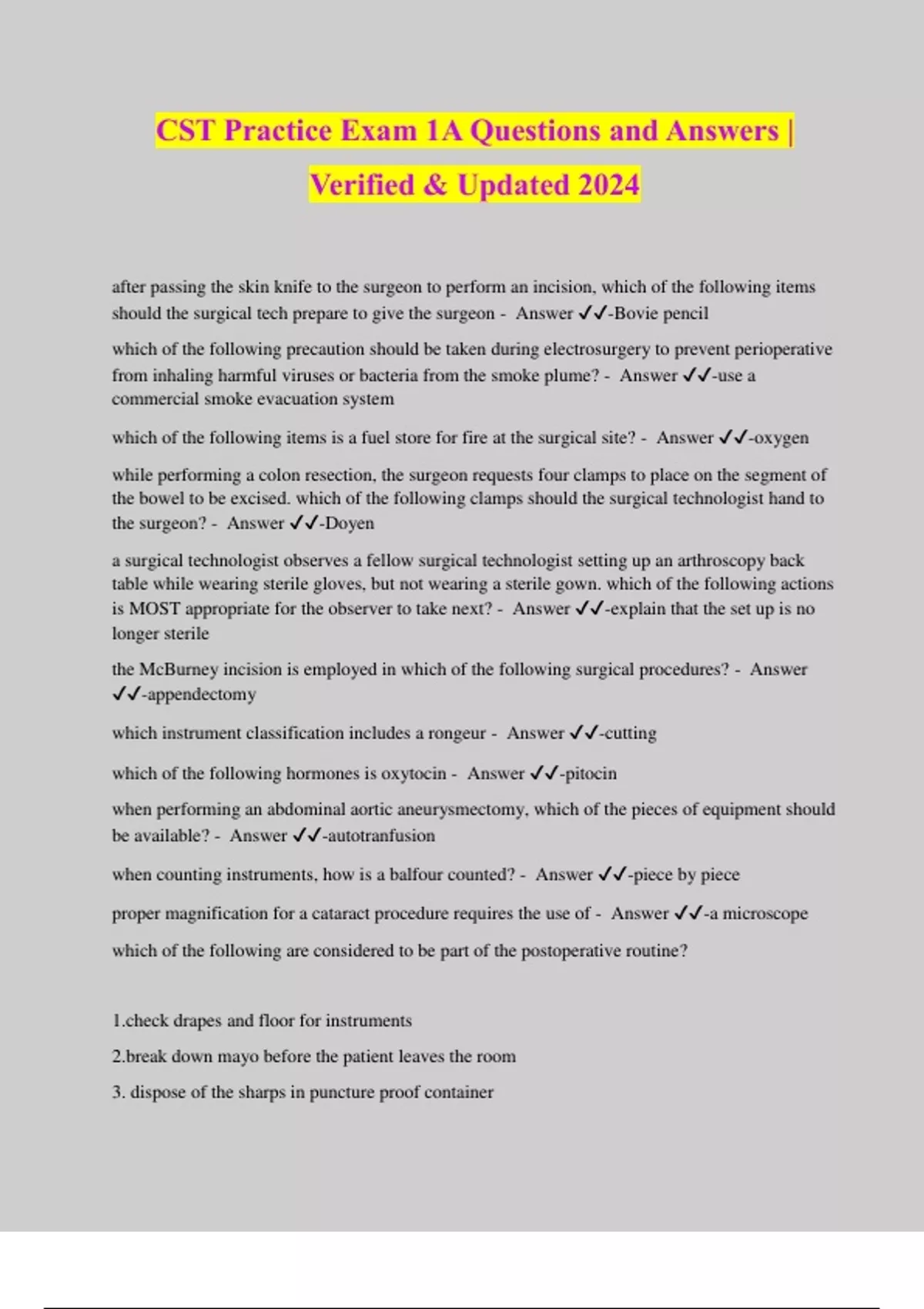 CST Practice Exam 1A Questions and Answers | Verified & Updated 2024 after passing the skin knife to the surgeon to perform an incision, which of the following items should the surgical tech prepare to give the surgeon - Answer ️️ -Bovie pencil which of the following precaution should be taken during electrosurgery to prevent perioperative from inhaling harmful viruses or bacteria from the smoke plume? - Answer ️️ -use a commercial smoke evacuation system which of the following items is a fuel store for fire at the surgical site? - Answer ️️ -oxygen while performing a colon resection, the surgeon requests four clamps to place on the segment of the bowel to be excised. which of the following clamps should the surgical technologist hand to the surgeon? - Answer ️️ -Doyen a surgical technologist observes a fellow surgical technologist setting up an arthroscopy back table while wearing sterile gloves, but not wearing a sterile gown. which of the following actions is MOST appropriate for the observer to take next? - Answer ️️ -explain that the set up is no longer sterile the McBurney incision is employed in which of the following surgical procedures? - Answer ️️ -appendectomy which instrument classification includes a rongeur - Answer ️️ -cutting which of the following hormones is oxytocin - Answer ️️ -pitocin when performing an abdominal aortic aneurysmectomy, which of the pieces of equipment should be available? - Answer ️️ -autotranfusion when counting instruments, how is a balfour counted? - Answer ️️ -piece by piece proper magnification for a cataract procedure requires the use of - Answer ️️ -a microscope which of the following are considered to be part of the postoperative routine? drapes and floor for instruments down mayo before the patient leaves the room 3. dispose of the sharps in puncture proof container 4. clean contaminated furniture and floor - Answer ️️ -1,3 and 4 only when is the BEST time to remove specimen from the sterile field? - Answer ️️ -When the surgeon gives permission a 32 year old male patient involved in a motor vehicle accident is in the OR for an exploratory laparotomy. the surgical technologist should prepare for splenectomy in addition to the exploratory laparotomy because the...? - Answer ️️ -spleen is the most commonly injured intra-abdominal organ After stabilizing the patient in the event of an equipment failure, the NEXT priority is to - Answer ️️ -remove the equipment from services a flexible ureteroscopy MUST be sterelized using - Answer ️️ -ethylene oxide sterilization which of the following structures can be connected during an AV fistula to achieve vascular access dialysis? - Answer ️️ -radial artery and cephalic vein which of the following instruments is used to insert k-wires? - Answer ️️ -mini-driver a craniotomy wound is irrigated frequently to...? - Answer ️️ -keep brain tissue moist which of the following are signs of hemorrhage? 1. bradycardia ension tension cardia - Answer ️️ -2 and 4 only which of the following is known as a fracture with bone protruding outside the skin? - Answer ️️ -compound raney clips are used in what surgical specialty? - Answer ️️ -neurosurgery a transversalis fascia defect medial to the deep epigastric vessels results in which of the following type of hernia? - Answer ️️ -direct which of the following safety devices would be used for both laser and x-ray procedures? - Answer ️️ -lead apro