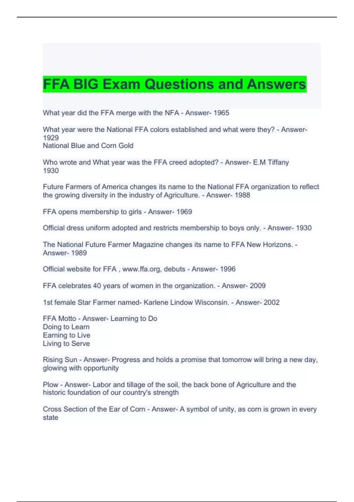 FFA BIG Exam Questions and Answers