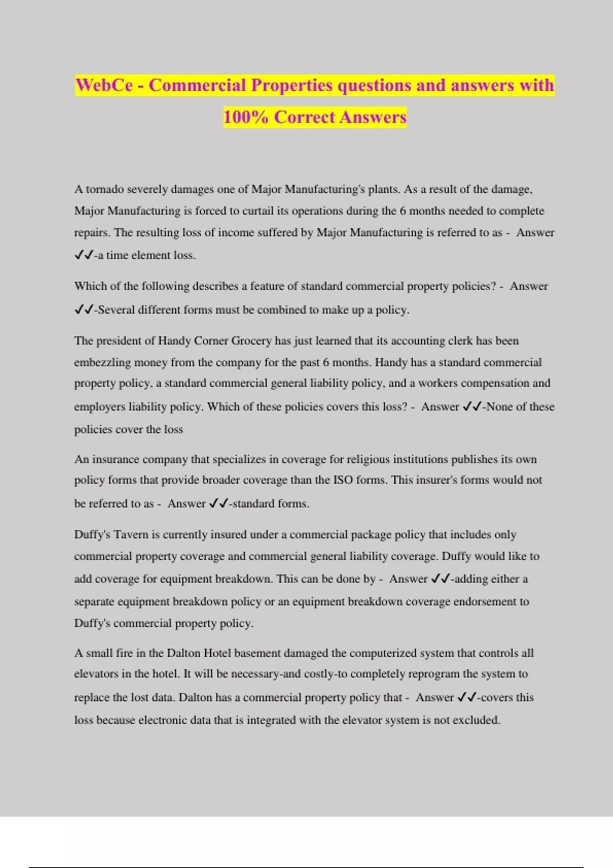 WebCe - Commercial Properties questions and answers with 100% Correct Answers A tornado severely damages one of Major Manufacturing's plants. As a result of the damage, Major Manufacturing is forced to curtail its operations during the 6 months needed to complete repairs. The resulting loss of income suffered by Major Manufacturing is referred to as - Answer ️️ -a time element loss. Which of the following describes a feature of standard commercial property policies? - Answer ️️ -Several different forms must be combined to make up a policy. The president of Handy Corner Grocery has just learned that its accounting clerk has been embezzling money from the company for the past 6 months. Handy has a standard commercial property policy, a standard commercial general liability policy, and a workers compensation and employers liability policy. Which of these policies covers this loss? - Answer ️️ -None of these policies cover the loss An insurance company that specializes in coverage for religious institutions publishes its own policy forms that provide broader coverage than the ISO forms. This insurer's forms would not be referred to as - Answer ️️ -standard forms. Duffy's Tavern is currently insured under a commercial package policy that includes only commercial property coverage and commercial general liability coverage. Duffy would like to add coverage for equipment breakdown. This can be done by - Answer ️️ -adding either a separate equipment breakdown policy or an equipment breakdown coverage endorsement to Duffy's commercial property policy. A small fire in the Dalton Hotel basement damaged the computerized system that controls all elevators in the hotel. It will be necessary-and costly-to completely reprogram the system to replace the lost data. Dalton has a commercial property policy that - Answer ️️ -covers this loss because electronic data that is integrated with the elevator system is not excluded