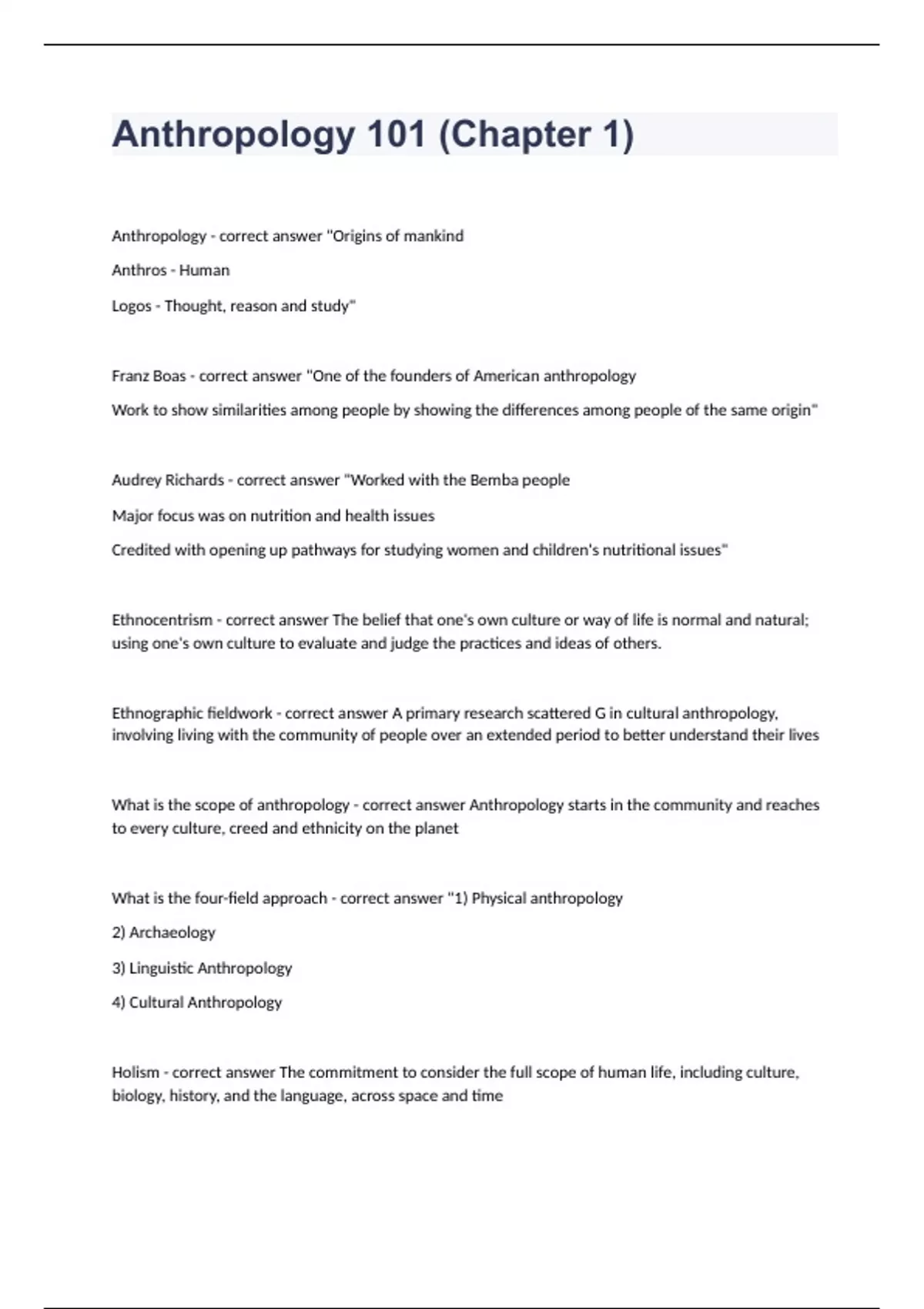 Anthropology 101 (Chapter 1)Anthropology - correct answer "Origins of mankind Anthros - Human Logos - Thought, reason and study" Franz Boas - correct answer "One of the founders of American anthropology Work to show similarities among people by showing the differences among people of the same origin" Audrey Richards - correct answer "Worked with the Bemba people Major focus was on nutrition and health issues Credited with opening up pathways for studying women and children's nutritional issues" Ethnocentrism - correct answer The belief that one's own culture or way of life is normal and natural; using one's own culture to evaluate and judge the practices and ideas of others. Ethnographic fieldwork - correct answer A primary research scattered G in cultural anthropology, involving living with the community of people over an extended period to better understand their lives What is the scope of anthropology - correct answer Anthropology starts in the community and reaches to every culture, creed and ethnicity on the planet What is the four-field approach - correct answer "1) Physical anthropology 2) Archaeology 3) Linguistic Anthropology 4) Cultural Anthropology Holism - correct answer The commitment to consider the full scope of human life, including culture, biology, history, and the language, across space and time