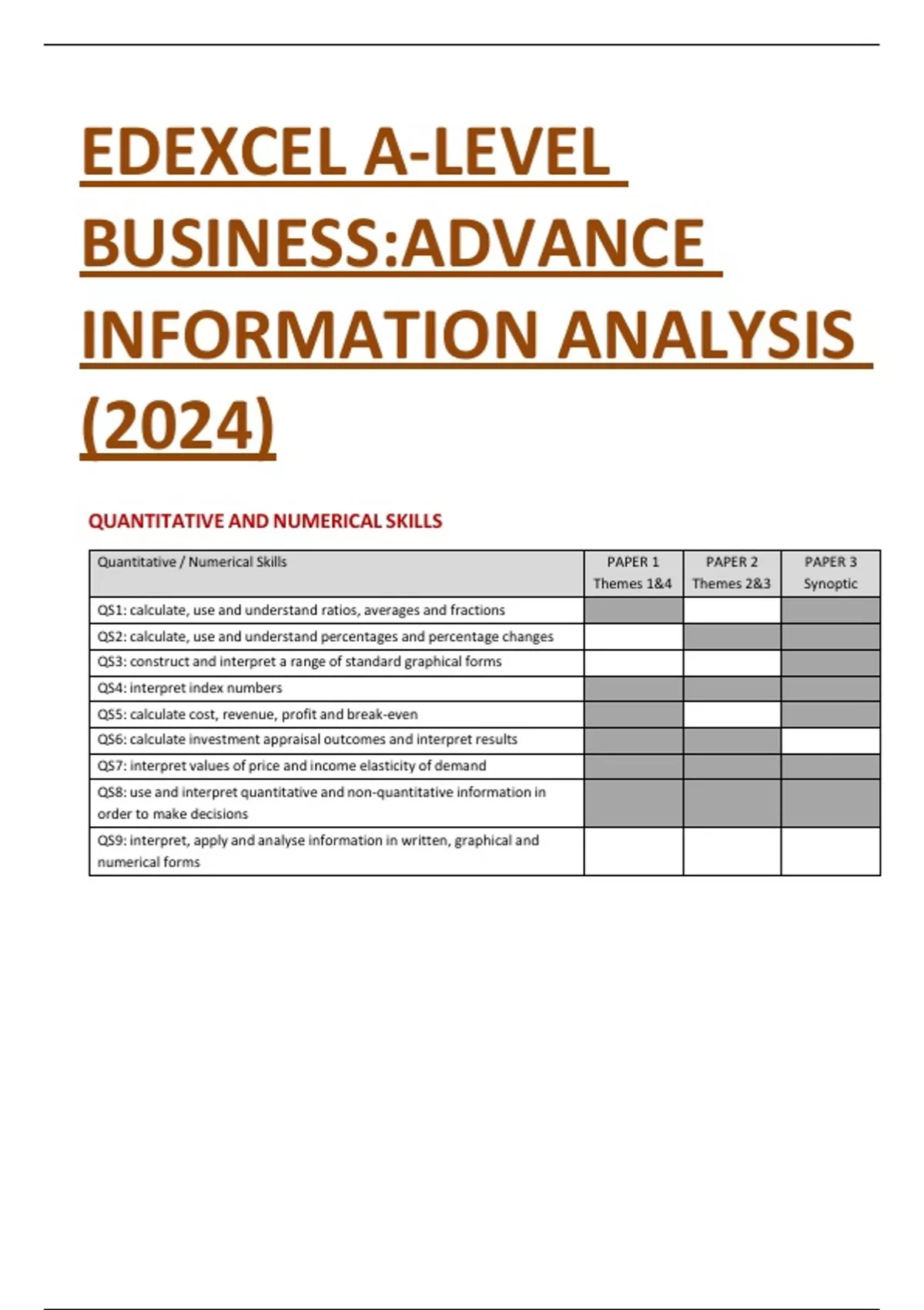 EDEXCEL A-LEVEL BUSINESS:ADVANCE INFORMATION ANALYSIS (2024)QUANTITATIVE AND NUMERICAL SKILLS Quantitative / Numerical Skills PAPER 1 Themes 1&4 PAPER 2 Themes 2&3 PAPER 3 Synoptic QS1: calculate, use and understand ratios, averages and fractions QS2: calculate, use and understand percentages and percentage changes QS3: construct and interpret a range of standard graphical forms QS4: interpret index numbers QS5: calculate cost, revenue, profit and break-even QS6: calculate investment appraisal outcomes and interpret results QS7: interpret values of price and income elasticity of demand QS8: use and interpret quantitative and non-quantitative information in order to make decisions QS9: interpret, apply and analyse information in written, graphical and numerical forms