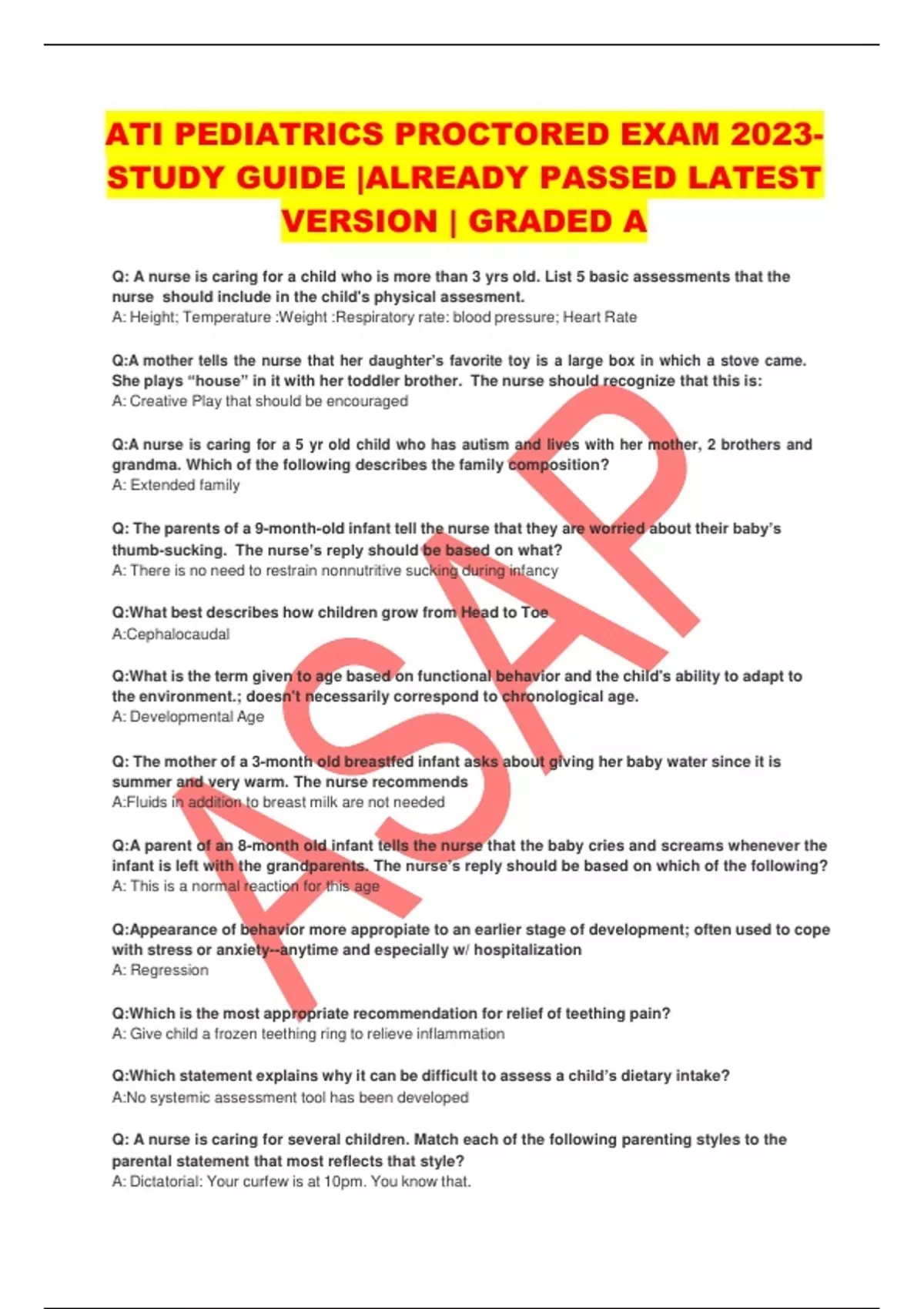 ATI PEDIATRICS PROCTORED EXAM 2023- STUDY GUIDE |ALREADY PASSED LATEST VERSION | GRADED A Q: A nurse is caring for a child who is more than 3 yrs old. List 5 basic assessments that the nurse should include in the child's physical assesment. A: Height; Temperature :Weight :Respiratory rate: blood pressure; Heart Rate Q:A mother tells the nurse that her daughter’s favorite toy is a large box in which a stove came. She plays “house” in it with her toddler brother. The nurse should recognize that this is: A: Creative Play that should be encouraged Q:A nurse is caring for a 5 yr old child who has autism and lives with her mother, 2 brothers and grandma. Which of the following describes the family composition? A: Extended family Q: The parents of a 9-month-old infant tell the nurse that they are worried about their baby’s thumb-sucking. The nurse’s reply should be based on what? A: There is no need to restrain nonnutritive sucking during infancy Q:What best describes how children grow from Head to Toe A:Cephalocaudal Q:What is the term given to age based on functional behavior and the child's ability to adapt to the environment.; doesn't necessarily correspond to chronological age. A: Developmental Age Q: The mother of a 3-month old breastfed infant asks about giving her baby water since it is summer and very warm. The nurse recommends A:Fluids in addition to breast milk are not needed Q:A parent of an 8-month old infant tells the nurse that the baby cries and screams whenever the infant is left with the grandparents. The nurse’s reply should be based on which of the following? A: This is a normal reaction for this age Q:Appearance of behavior more appropiate to an earlier stage of development; often used to cope with stress or anxiety--anytime and especially w/ hospitalization A: Regression Q:Which is the most appropriate recommendation for relief of teething pain? A: Give child a frozen teething ring to relieve inflammation Q:Which statement explains why it can be difficult to assess a child’s dietary intake? A:No systemic assessment tool has been developed Q: A nurse is caring for several children. Match each of the following parenting styles to the parental statement that most reflects that style? A: Dictatorial: Your curfew is at 10pm. You know that. Democratic: Tonight is a school night, so you need to come home at 10. Permissive: As long as you get your homework done. Q: Frequent developmental assessments are important for which reason? A: Critical periods of development occur during childhood. Rationale- 1 Infancy is a dynamic time of development that requires frequent evaluations to assess appropriate developmental progress. 2 Infants in a nurturing environment will develop appropriately and will not necessarily need stimulation specific to their developmental stage. 3 Critical periods are blocks of time during which children are ready to master specific developmental tasks. Children can master these tasks more easily during particular periods of time in their growth and developmental process. 4 Normal growth and development is orderly and proceeds in a predictable pattern on the basis of each individuals abilities and potentials