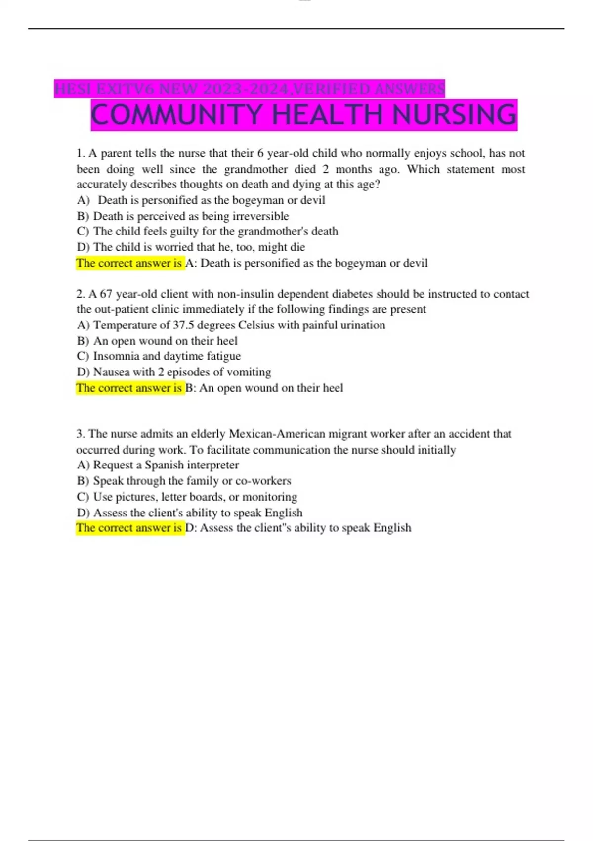 HESI EXIT V6 NEW ,VERIFIED ANSWERS COMMUNITY HEALTH NURSING