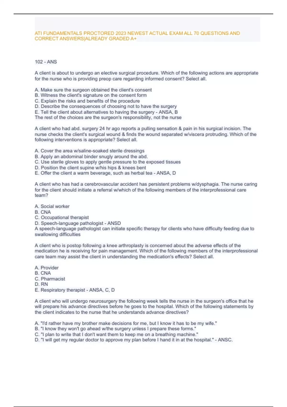 ATI FUNDAMENTALS PROCTORED 2023 NEWEST ACTUAL EXAM ALL 70 QUESTIONS AND CORRECT ANSWERS ALREADY GRADED A+