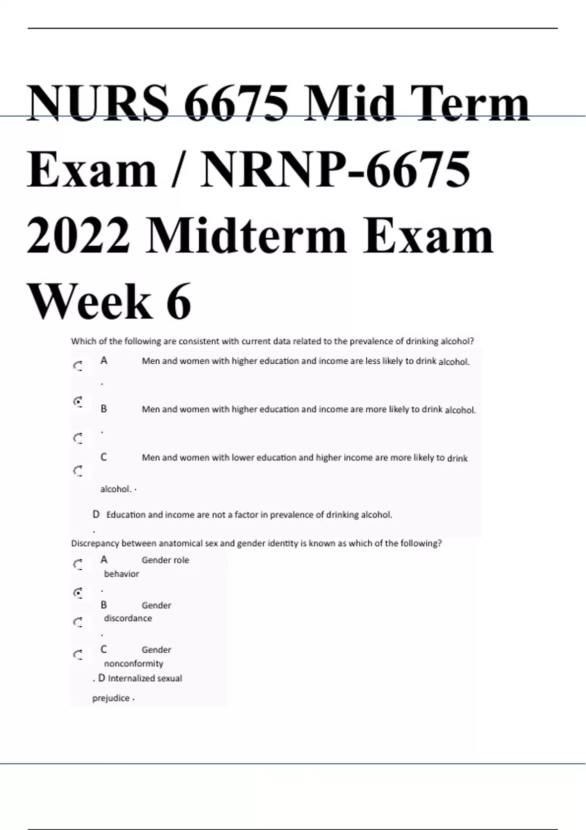 NURS 6675 Mid Term Exam / NRNP-6675 2022 Midterm Exam Week 6Which of the following are consistent with current data related to the prevalence of drinking alcohol? A Men and women with higher education and income are less likely to drink alcohol. . B Men and women with higher education and income are more likely to drink alcohol. . C Men and women with lower education and higher income are more likely to drink alcohol. . D Education and income are not a factor in prevalence of drinking alcohol. . Discrepancy between anatomical sex and gender identity is known as which of the following? A Gender role behavior . B Gender discordance . C Gender nonconformity . D Internalized sexual prejudice . S - The Marketplace to Buy and Sell your Study Material STUVIAU The fear of social situations, including situations that involve scrutiny or contact with strangers is known as which of the following? A Specific phobia . B Social anxiety disorder . C Generalized anxiety disorder . D Avoidant personality disorder . Recurrent preoccupation with sexual urges and fantasies involving the act of being humiliated, beaten, bound, or otherwise made to suffer is known as which of the following? A Frotteurism . B Sexual Sadism . C Sexual Masochism* . D Other Specified Paraphilic Disorder . Which of the following is not consistent with the onset of OCD? A More than half of patients with OCD have a sudden onset of symptoms. . B The onset of symptoms for about 50 – 70 percent of patients occurs after a stressful event. . C Most patients keep their symptoms secret initially. . D The onset of OCD is typically preceded by OCD personality traits. . Which of the following neurotransmitters increases libido? S - The Marketplace to Buy and Sell your Study Material STUVIAU A term used to designate the behavioral patterns of family members who have been significantly affected by another family member’s substance use or addiction is which of the following? Data indicate which of the following regarding women drinking while pregnant or breast feeding? A Women who are pregnant or are breast-feeding should not drink alcohol. . B Women who are pregnant should not drink alcohol but drinking alcohol while breast-feeding is not a risk to the baby. . C Women who are pregnant or breast-feeding can drink one alcoholic drink up to 3 times per week without concern for risk to the fetus or baby. . D Women who are pregnant or breastfeeding can safely drink occasionally without risk to the fetus . The recurrent urge to expose one’s genitals to a stranger is known as which of the following? A Fetishism . B Voyeurism S - The Marketplace to Buy and Sell your Study Material STUVIAU . C Exhibitionism . D Paraphilic disorder . A patient reports having a panic attack several years ago in an elevator and since then has avoided using elevators. This patient meets criteria for which of the following? A Social phobia . B Specific phobia . C General anxiety disorder unspecified . D Obsessive-compulsive disorder . The APRN consensus model did which of the following? A Merged adult, gerontology and pediatric foci so that all NPs could truly work across the lifespan. . B Adult and gerontology were merged and identified as primary care or acute care. . C Psychiatric-mental health foci was stipulated as across the lifespan. . D B and C . Antipsychotic medications provide D2 blockade in the mesocortical pathway causing which of the following effects? A Reduces negative symptoms . B Increases extrapyramidal symptoms (EPS) . C Causes prolactinemia . D Reduces positive symptoms . Major neurotransmitters possibly involved in developing substance abuse and substance dependence include which of the following? S - The Marketplace to Buy and Sell your Study Material STUVIAU Which of the following is not consistent with benzodiazepine withdrawal? A Benzodiazepine withdrawal can continue to develop for several weeks. . B The best way to proceed with benzodiazepine withdrawal is to stop it immediately and treat withdrawal symptoms. . C It may be helpful to switch to a long-acting benzodiazepine for withdrawal. . D If patient is on a therapeutic benzodiazepine dose, initiate 10–25 percent dose reduction and evaluate response. . A disorder characterized by acquiring and not discarding things that are deemed to be of little or no value, resulting in excessive clutter of living spaces is A Specific Phobia . B Trichotillomania . C Hoarding Disorder . D Obsessive-Compulsive Disorder . A period of at least 6 months of recurrent and intense sexual arousal from cross-dressing that causes clinically significant distress or impairment is consistent with which of the following? A Gender dysphoria . B Turner’s syndrome . C Transvestic Disorder . D Klinefelter’s syndrome . Testosterone increases libido in which of the following? S - The Marketplace to Buy and Sell your Study Material STUVIAU A Testosterone increases libido in men. . B Testosterone increases libido in women . C Testosterone increases libido in men and women. . D Testosterone effects male characteristics but is not instrumental in libido. . According to HIPPA, which of the following must the NP share their NPI number with? Check all that apply. A Health plans . B Other providers . C Any entity that may need it for billing purposes . D A and C only . Which of the following would be characterized as a negative symptom of schizophrenia? A Hallucinations and delusions . B Impaired social and occupational functioning . C Isolation and impaired self-care . D B and C only . A diffuse, unpleasant, vague sense of apprehension, often accompanied by autonomic symptoms which varies among persons is commonly known as which of the following? S - The Marketplace to Buy and Sell your Study Material STUVIAU A condition in which an enzymatic defect in the production of adrenal cortisol, beginning prenatally, leads to overproduction of adrenal androgens and, when the chromosomes are XX, virilization of the female fetus, is kn