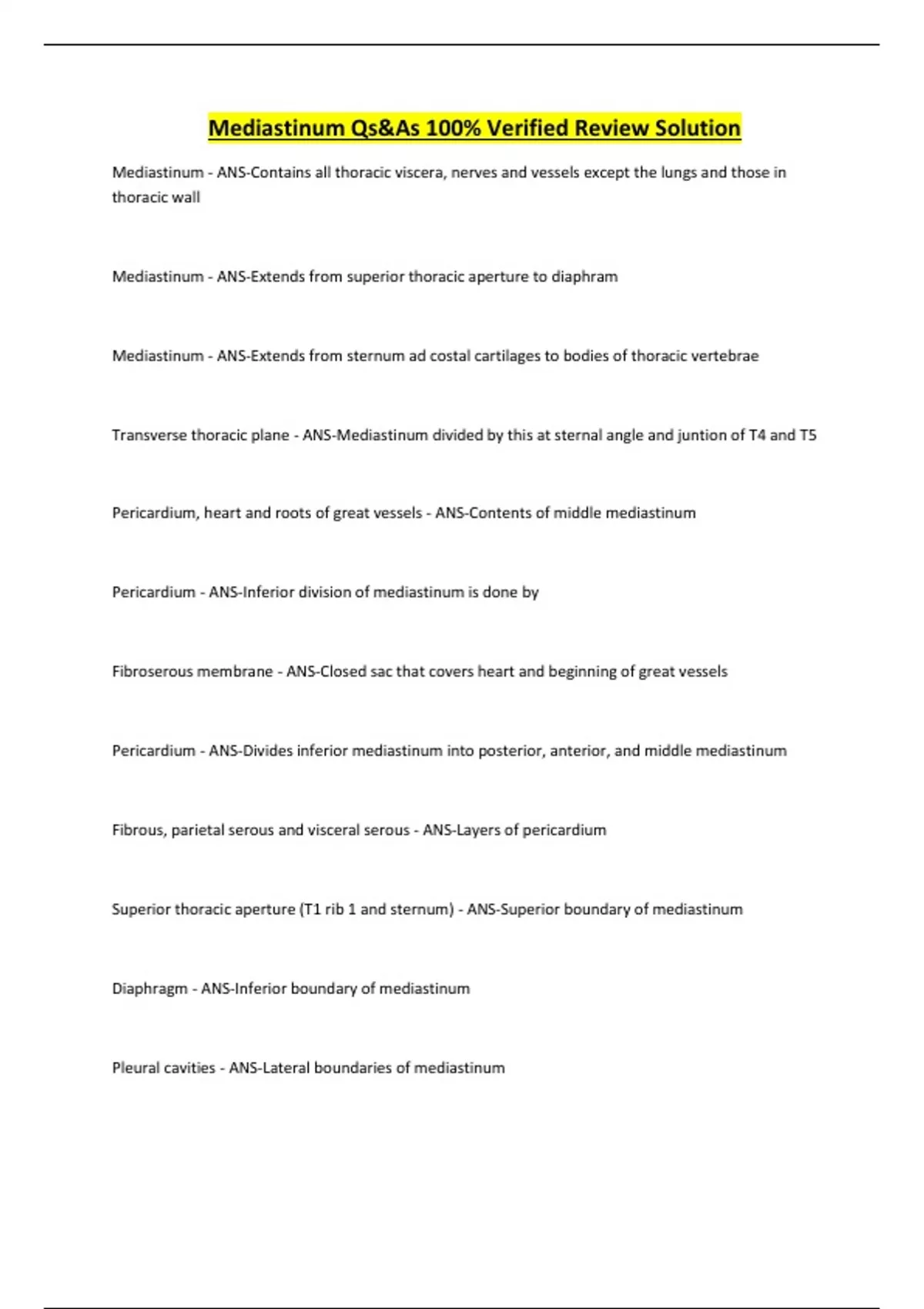 Mediastinum Qs&As 100% Verified Review Solution Mediastinum - ANS-Contains all thoracic viscera, nerves and vessels except the lungs and those in thoracic wall Mediastinum - ANS-Extends from superior thoracic aperture to diaphram Mediastinum - ANS-Extends from sternum ad costal cartilages to bodies of thoracic vertebrae Transverse thoracic plane - ANS-Mediastinum divided by this at sternal angle and juntion of T4 and T5 Pericardium, heart and roots of great vessels - ANS-Contents of middle mediastinum Pericardium - ANS-Inferior division of mediastinum is done by Fibroserous membrane - ANS-Closed sac that covers heart and beginning of great vessels Pericardium - ANS-Divides inferior mediastinum into posterior, anterior, and middle mediastinum Fibrous, parietal serous and visceral serous - ANS-Layers of pericardium Superior thoracic aperture (T1 rib 1 and sternum) - ANS-Superior boundary of mediastinum Diaphragm - ANS-Inferior boundary of mediastinum Pleural cavities - ANS-Lateral boundaries of mediastinum Sternum - ANS-Anterior boundary of mediastinum Bodies of thoracic vertebrae - ANS-Posterior boundary of medaistinum Pericardial cavity (parietal and visceral serous pericard) - ANS-Contains fluid that enables heart to move and beat in frictionless environment Visceral serous pericardium - ANS-Extends onto beginning of great vessels, continuous with parietal layer of serous pericardium Visceral serous pericardium - ANS-Continuous with tunica of great vessels, central tendon of diaphragm Aorta - ANS-Comes out of left ventricle Superior vena cava - ANS-Comes out of right atrium Pulmonary trunk - ANS-Comes out of right ventricle Atrialventricular sulcus - ANS-Splits ventricles and atrium Anterior interventricular sulcus - ANS-Splits right and left ventricles on anterior side Right coronary artery - ANS-Comes out of aorta and splits into sinuatrial artery and right marginal artery into anterior interventricular sulcus which runs with small cardiac vein Left coronary artery - ANS-Comes out of aorta and divides into circumflex artery and anterior ventricular artery running into sulcus Great cardiac vein - ANS-Travels with anterior interventricular sulcus Posterior interventricular artery - ANS-In posterior view, right coronary artery becomes this "third branch" Right artrium - ANS-Has opening for coronary sinus Fossa ovale - ANS-Last during development to close Right side of heart - ANS-Receives poorly oxygenated blood thru SVC and IVC Right side of heart - ANS-Pumps de-oxygeated blood thru pulmonary trunk arteries to lungs for oxygenation Left side of heart - ANS-Receives oxygenated blood via pulmonary veins into left atrium Left side of heart - ANS-Pumps oxygenated blood into aorta and to arteries of body Right and left atria - ANS-Receiving chambers that pump blood into ventricles Right and left ventricles - ANS-Discharging chambers Epicardium - ANS-Thin external layer of heart formed by visceral serous pericardium Myocardium - ANS-Thick, helical middle layer composed of cardiac muscle