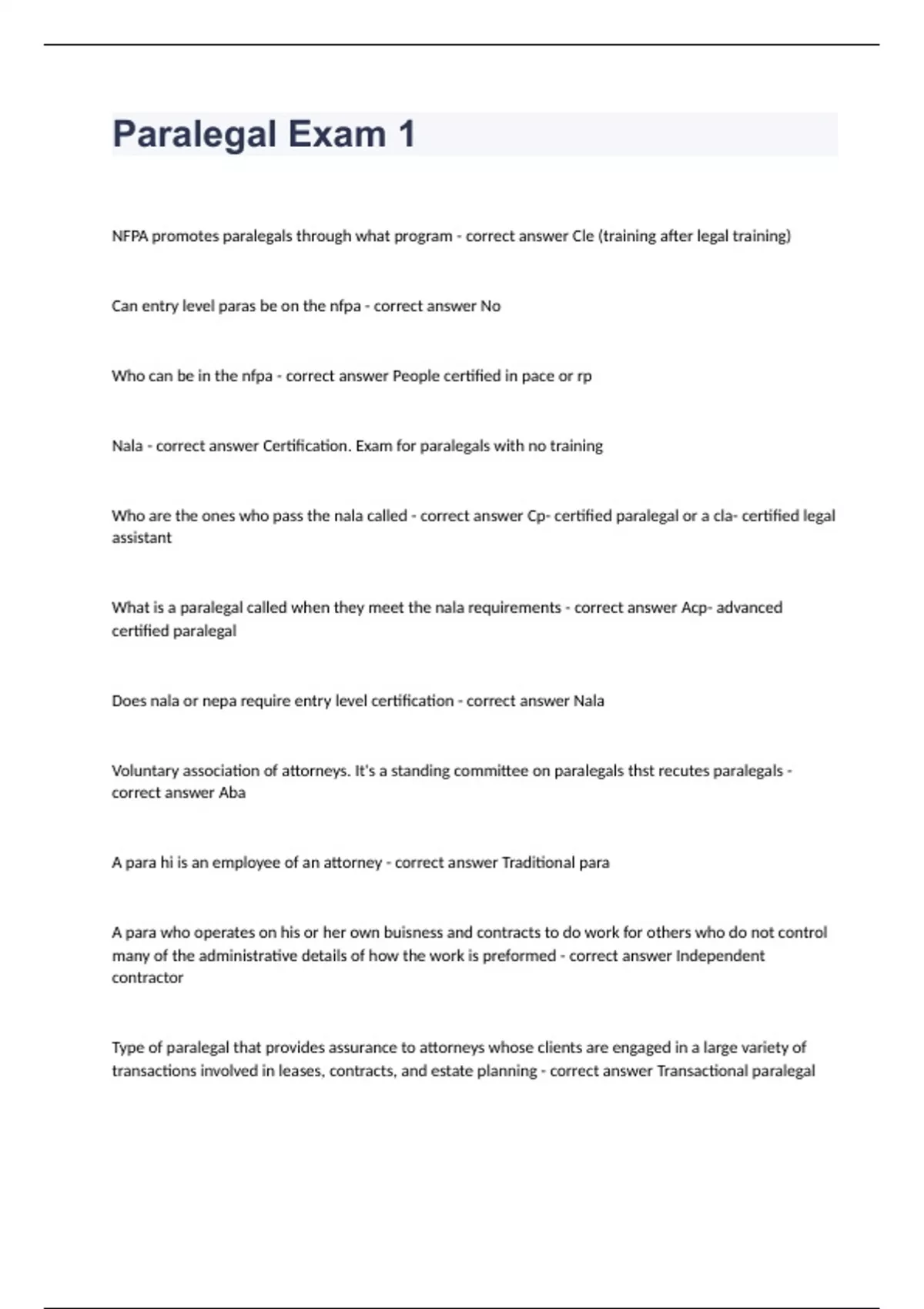 Paralegal Exam 1 Question and answers already passed 2023/2024 NFPA promotes paralegals through what program - correct answer Cle (training after legal training) Can entry level paras be on the nfpa - correct answer No Who can be in the nfpa - correct answer People certified in pace or rp Nala - correct answer Certification. Exam for paralegals with no training Who are the ones who pass the nala called - correct answer Cp- certified paralegal or a cla- certified legal assistant