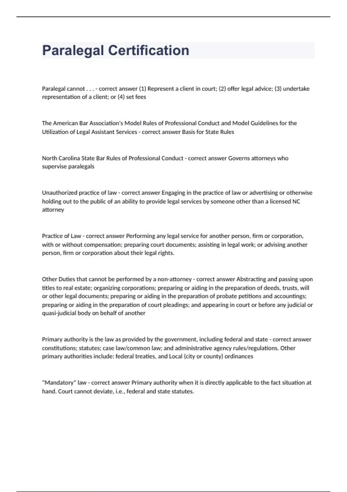 Paralegal Certification Questions with complete solution 2023/2024Paralegal cannot . . . - correct answer (1) Represent a client in court; (2) offer legal advice; (3) undertake representation of a client; or (4) set fees The American Bar Association's Model Rules of Professional Conduct and Model Guidelines for the Utilization of Legal Assistant Services - correct answer Basis for State Rules North Carolina State Bar Rules of Professional Conduct - correct answer Governs attorneys who supervise paralegals Unauthorized practice of law - correct answer Engaging in the practice of law or advertising or otherwise holding out to the public of an ability to provide legal services by someone other than a licensed NC attorney Practice of Law - correc