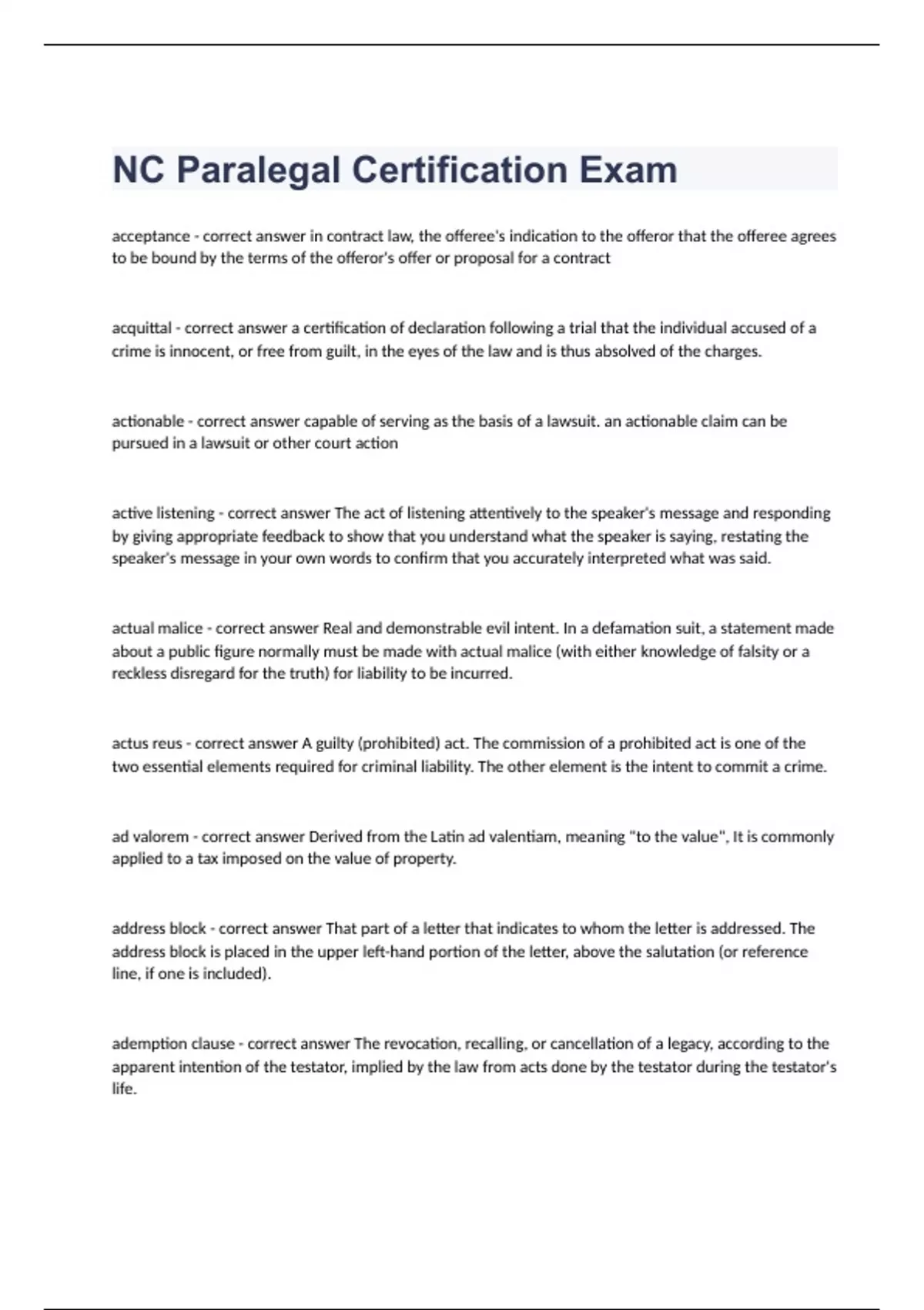 NC Paralegal Certification Exam Question and answers 100% correct 2023/2024 acceptance - correct answer in contract law, the offeree's indication to the offeror that the offeree agrees to be bound by the terms of the offeror's offer or proposal for a contract acquittal - correct answer a certification of declaration following a trial that the individual accused of a crime is innocent, or free from guilt, in the eyes of the law and is thus absolved of the charges. actionable - correct answer capable of serving as the basis of a lawsuit. an actionable claim can be pursued in a lawsuit or other court action active listening - correct answer The act of listening attentively to the speaker's message and responding by giving appropriate feedback to show that you understand what the speaker is saying, restating the speaker's message in your