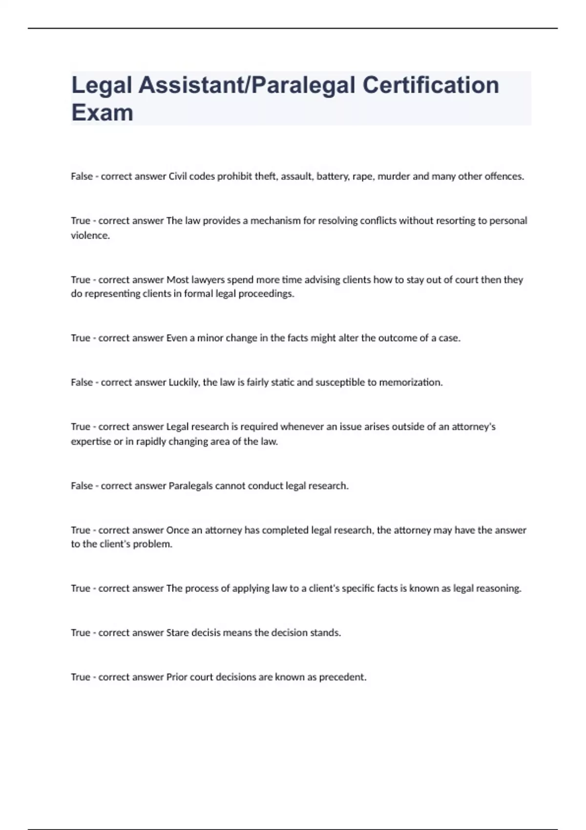 True - correct answer The process of applying law to a client's specific facts is known as legal reasoning.