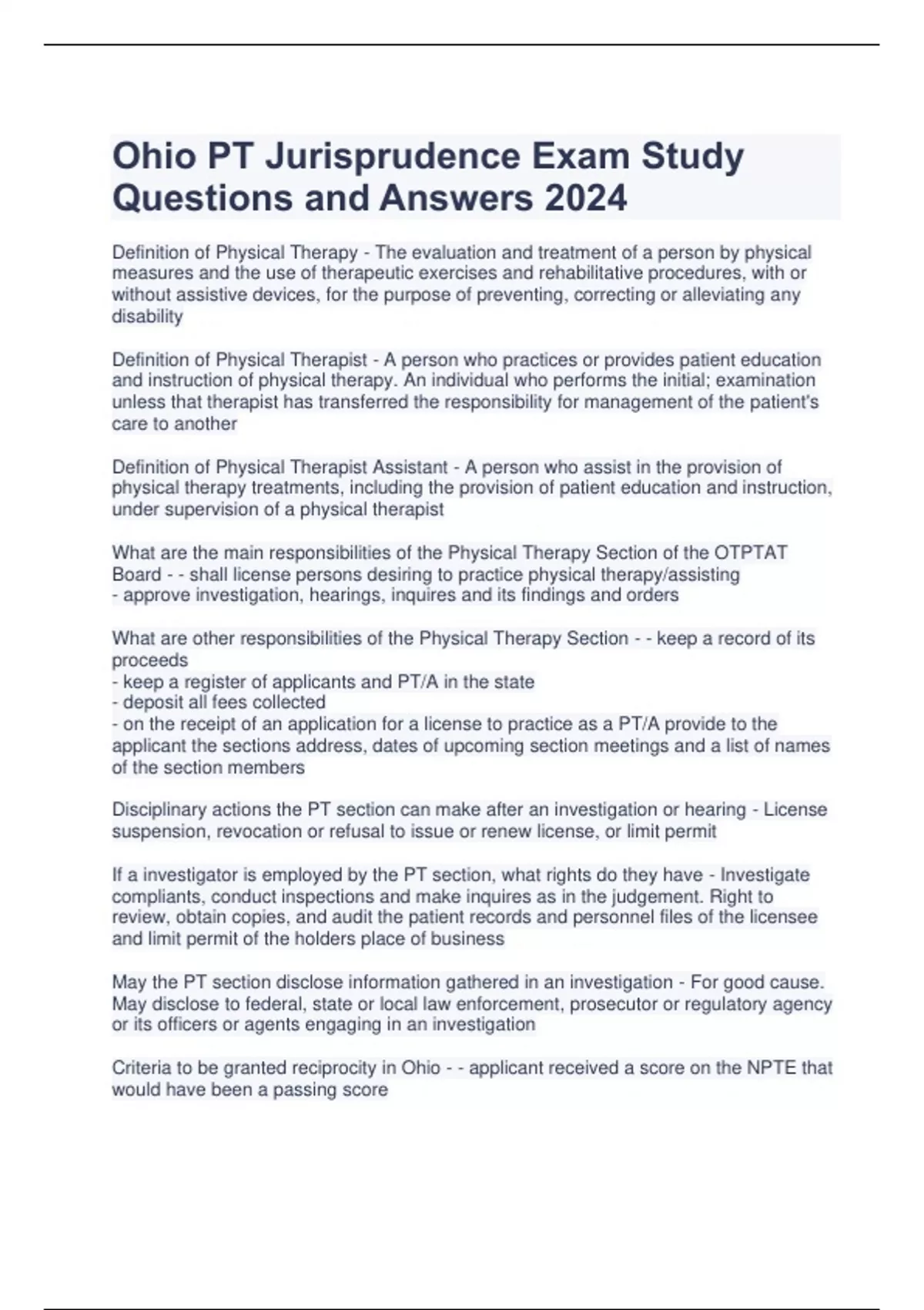 Ohio PT Jurisprudence Exam Study Questions and Answers 2024