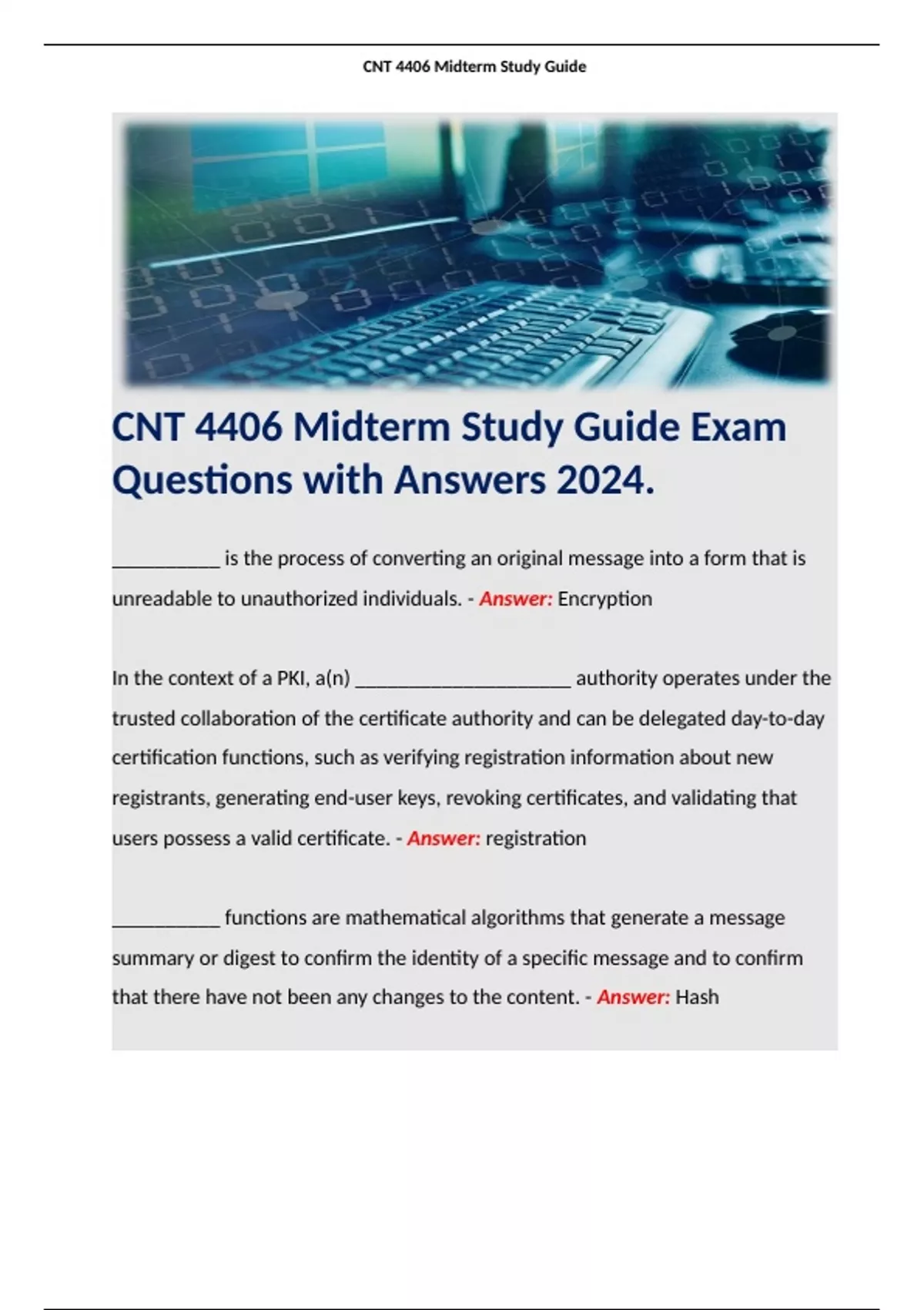 CNT 4406 Midterm Study Guide Exam Questions with Answers 2024. Terms like: __________ is the process of converting an original message into a form that is unreadable to unauthorized individuals. - Answer: Encryption