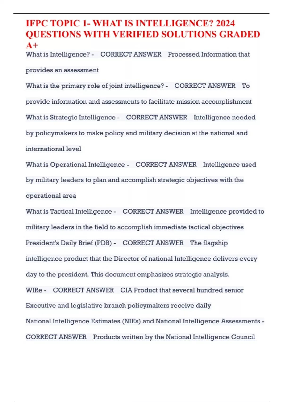 IFPC TOPIC 1- WHAT IS INTELLIGENCE? 2024 QUESTIONS WITH VERIFIED SOLUTIONS GRADED A+ What is Intelligence? - CORRECT ANSWER Processed Information that provides an assessment What is the primary role of joint intelligence? - CORRECT ANSWER To provide information and assessments to facilitate mission accomplishment What is Strategic Intelligence - CORRECT ANSWER Intelligence needed by policymakers to make policy and military decision at the national and international level What is Operational Intelligence - CORRECT ANSWER Intelligence used by military leaders to plan and accomplish strategic objectives with the operational area What is Tactical Intelligence - CORRECT ANSWER Intelligence provided to military leaders in the field to accomplish immediate tactical objectives President's Daily Brief (PDB) - CORRECT ANSWER The flagship intelligence product that the Director of national Intelligence delivers every day to the president. This document emphasizes strategic analysis. WIRe - CORRECT ANSWER CIA Product that several hundred senior Executive and legislative branch policymakers receive daily National Intelligence Estimates (NIEs) and National Intelligence Assessments - CORRECT ANSWER Products written by the National Intelligence Council IFPC TOPIC 1- WHAT IS INTELLIGENCE? 2024 QUESTIONS WITH VERIFIED SOLUTIONS GRADED A+ (NIC) with input from the entire Intelligence Community (IC). NIEs often provide a longer-term perspective on issues of critical national security Secretary of Defense/Chairman of the Joint Chiefs of Staff Daily Intelligence Update (SECDEF/CJCS J2 Daily Intelligence Update) - CORRECT ANSWER Department of Defense (DoD) Product that the DoD leadership receives daily Secretary's Morning Su