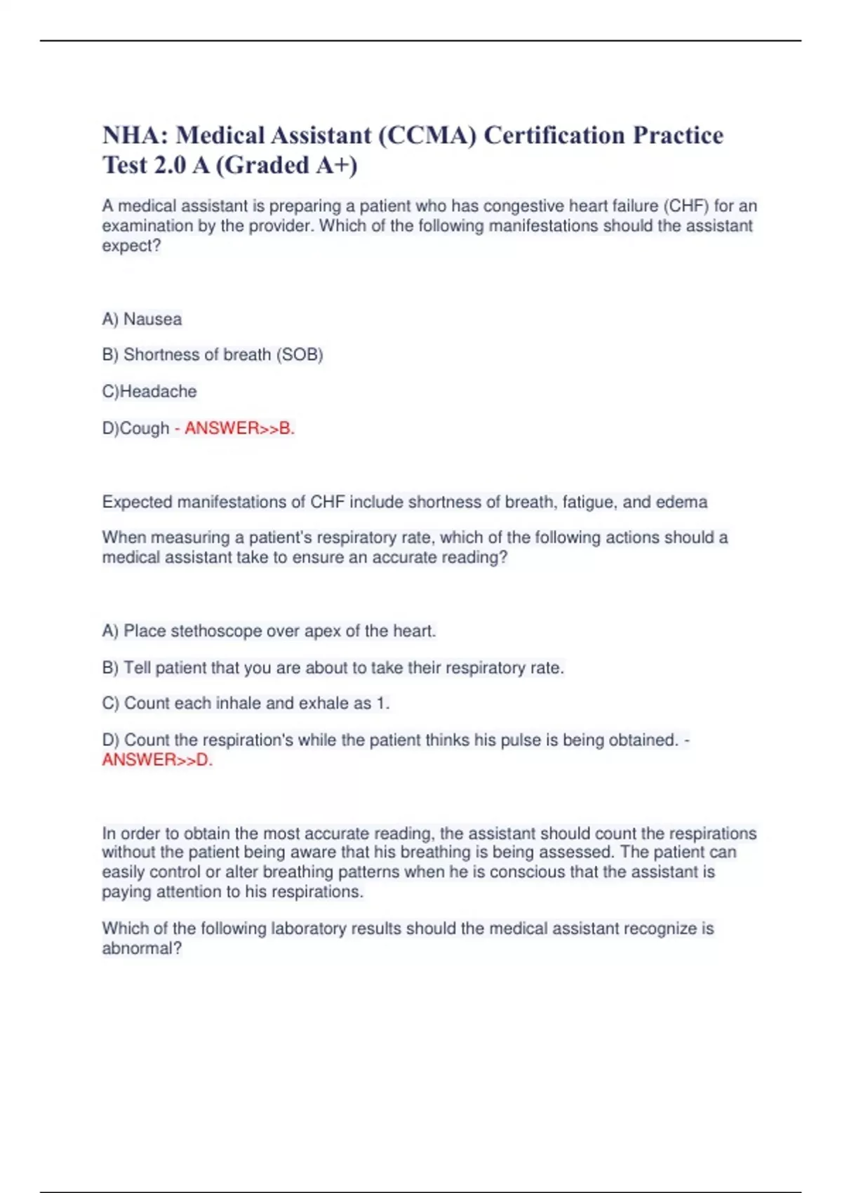 NHA: Medical Assistant (CCMA) Certification Practice Test 2.0 A (Graded A+) A medical assistant is preparing a patient who has congestive heart failure (CHF) for an examination by the provider. Which of the following manifestations should the assistant expect? A) Nausea B) Shortness of breath (SOB) C)Headache D)Cough - ANSWER>>B. Expected manifestations of CHF include shortness of breath, fatigue, and edema When measuring a patient’s respiratory rate, which of the following actions should a medical assistant take to ensure an accurate reading? A) Place stethoscope over apex of the heart. B) Tell patient that you are about to take their respiratory rate. C) Count each inhale and exhale as 1. D) Count the respiration's while the patient thinks his pulse is being obtained. - ANSWER>>D. In order to obtain the most accurate reading, the assistant should count the respirations without the patient being aware that his breathing is being assessed. The patient can easily control or alter breathing patterns when he is conscious that the assistant is paying attention to his respirations. Which of the following laboratory results should the medical assistant recognize is abnormal? A) Creatine 1 mg/dl B) Potassium 3 me/L C) Glucose 87 mg/dl D) Sodium 138 mmoI/L - ANSWER>>B. This potassium level is below the expected reference range of 3.5 to 5 mEq/L. A provider has requested a dissecting instrument on a sterile tray that a medical assistant is preparing. Which of the following instruments should the assistant include on the tray? A) Scissors B) Lancet C) Forceps D) Mosquito Clamp - ANSWER>>A. Scissors are considered cutting and dissecting instruments because they include a sharp blade or surface that can cut, dissect, or scrape. A medical assistant is replacing a sharps container in an examination room and receives a small laceration on her arm from the plastic lid. Which of the following types of documentation should the assistant complete as a result of this incident? A) OSHA Form 301 B) CMS 1500 C) Form A223 D) General Incident Report - ANSWER>>A. The assistant should recognize that the OSHA Form 301 is an incident report used when reporting details about a work-related injury or illness. A medical assistant is reviewing a patient's history prior to the patient's appointment. Which of the following laboratory results indicates the need to schedule an extension of the current visit? A) Fasting blood glucose 87 mg/dL B) Ceruloplasmin 32 mg/dL C) Fasting blood glucose 168 mg/dL D) Magnesium 1.8 mEq/L - ANSWER>>C. This fasting blood glucose level is above the expected reference range of 70 to 130 mg/dL. The assistant should notify the provider and schedule an extension of the patient's visit. A medical assistant is reinforcing instructions with a patient about how to take a buccal tablet. Which of the following instructions should the assistant give the patient? A) "Place the tablet under your tongue." B) "Take the tablet with a full glass of water." C) "Place the tablet between you or gums and cheek." D) "Let the tablet fully dissolve on your tongue." - ANSWER>>C. The assistant should instruct the patient to place the buccal tablet between his gums and his cheek. A buccal tablet acts faster than oral tablets because it does not need to pass through the gastrointestinal tract to be absorbed. Which of the following terms should a medical assistant use to tell a provider that a patient is having discomfort and difficulty breathing? A) Apnea B) Cyanosis C) Dysphasia