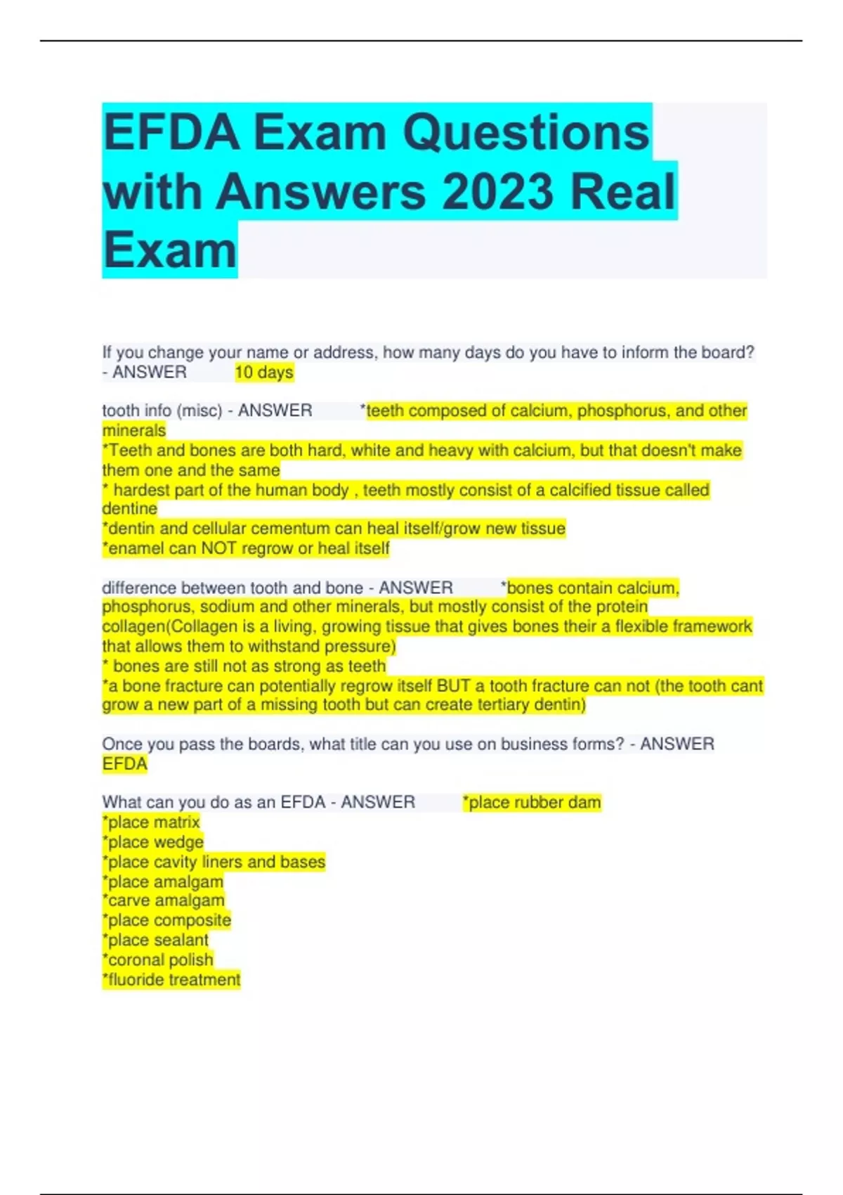 EFDA Exam Questions with Answers 2023 Real Exam If you change your name or address, how many days do you have to inform the board? - ANSWER 10 days tooth info (misc) - ANSWER *teeth composed of calcium, phosphorus, and other minerals *Teeth and bones are both hard, white and heavy with calcium, but that doesn't make them one and the same * hardest part of the human body , teeth mostly consist of a calcified tissue called dentine *dentin and cellular cementum can heal itself/grow new tissue *enamel can NOT regrow or heal itself difference between tooth and bone - ANSWER *bones contain calcium, phosphorus, sodium and other minerals, but mostly consist of the protein collagen(Collagen is a living, growing tissue that gives bones their a flexible framework that allows them to withstand pressure) * bones are still not as strong as teeth *a bone fracture can potentially regrow itself BUT a tooth fracture can not (the tooth cant grow a new part of a missing tooth but can create tertiary dentin) Once you pass the boards, what title can you use on business forms? - ANSWER EFDA What can you do as an EFDA - ANSWER *place rubber dam *place matrix *place wedge *place cavity liners and bases *place amalgam *carve amalgam *place composite *place sealant *coronal polish *fluoride treatment What CANT you do as an EFDA - ANSWER *diagnose *treatment plan *cut hard or soft tissue *prescribe drugs *sign lab slips *approve final occlusion *do a direct pulp cap *cement FINAL restorations *administer anesthesia *take final impressions *CANT work if dentist isn't in office *doctor has to check all restorations if you suspect child abuse with a patient what do you do? - ANSWER Report to supervisor or call hotline what is C.E? - ANSWER Contiuing education *10 hours every 2 years *license is renewed every 2 years *fee for renewal is $25.00 How many tooth surfaces are there on a tooth and what are they? - ANSWER 5 surfaces *mesial *distal *facial/buccal *lingual *occlusal/incisal PRIMARY TEETH: how many teeth in a quadrant? how many teeth in an arch? - ANSWER 5 teeth in quadrant 10 in arch 20 total PERMANENT TEETH: how many teeth in quadrant? how many teeth in arch? - ANSWER 8 in quadrent 16 in arch 32 total how many teeth are in an anterior sextant? - ANSWER 6 What is the anatomical crown? - ANSWER the part of the crown that is covered with enamel, can be above and below the gumline what is the clinical crown? - ANSWER visible portion of the anatomical crown