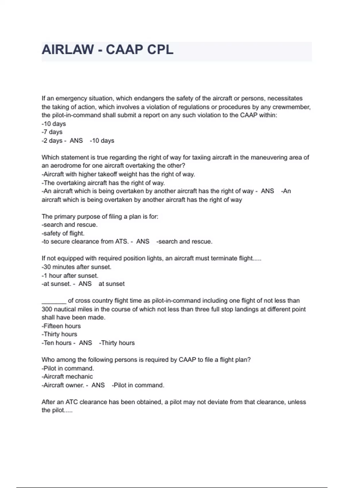 AIRLAW - CAAP CPL EXAM QUESTIONS WITH SOLUTIONS If an emergency situation, which endangers the safety of the aircraft or persons, necessitates the taking of action, which involves a violation of regulations or procedures by any crewmember, the pilot-in-command shall submit a report on any such violation to the CAAP within: -10 days -7 days -2 days - ANS -10 days Which statement is true regarding the right of way for taxiing aircraft in the maneuvering area of an aerodrome for one aircraft overtaking the other? -Aircraft with higher takeoff weight has the right of way. -The overtaking aircraft has the right of way. -An aircraft which is being overtaken by another aircraft has the right of way - ANS -An aircraft which is being overtaken by another aircraft has the right of way The primary purpose of filing a plan is for: -search and rescue. -safety of flight. -to secure clearance from ATS. - ANS -search and rescue. If not equipped with required position lights, an aircraft must terminate flight..... -30 minutes after sunset. -1 hour after sunset. -at sunset. - ANS at sunset _______ of cross country flight time as pilot-in-command including one flight of not less than 300 nautical miles in the course of which not less than three full stop landings at different point shall have been made. -Fifteen hours -Thirty hours -Ten hours - ANS -Thirty hours Who among the following persons is required by CAAP to file a flight plan? -Pilot in command. -Aircraft mechanic -Aircraft owner. - ANS -Pilot in command. After an ATC clearance has been obtained, a pilot may not deviate from that clearance, unless the pilot..... -receives an amended clearance or less an emergency. -requests an amended clearance. -is operating VFR on top. - ANS receives an amended clearance or less an emergency. Aerial photography is prohibited in the Philippines without proper authorization from..... -Philippine Air Force -NAMRIA -CAAP - ANS -CAAP All flights of civil aircraft over the Manila Flight Information Region and landing at Philippine aerodrome shall be carried out in accordance with.......... -The current regulations and policies. -at the discretion of the civil aircraft operator. -policy procedures of the civil aircraft operator. - ANS -The current regulations and policies. If weather conditions are such that it requires designating an alternate airport on your IFR flight plan, you should plan to carry enough fuel to arrive at the first airport of intended landing, fly from that airport to the alternate airport, fly thereafter... -45 minutes at normal cruising speed. -1 hour at normal cruising speed. -30 minutes at slow cruising speed. - ANS -45 minutes at normal cruising speed. An applicant for CPL shall be a qualified person who is a citizen of the Philippines or: -a qualified citizen of a foreign country granting similar rights and privileges to citizens of the Philippines; subject, however to existing treaty or treaties, and agreements entered into by the Philippines government with foreign countries, and subject -any citizen of foreign country. -executive to Filipino nationals only - ANS -a qualified citizen of a foreign country granting similar rights and privileges to citizens of the Philippines; subject, however to existing treaty or treaties, and agreements entered into by the Philippines government with foreign countries, and subject